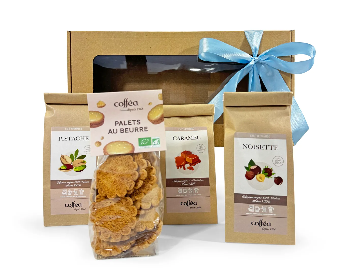 Laissez-vous emporter par un trio de cafés aromatisés audacieux et gourmands. Noisette onctueux, pistache créatif et caramel réconfortant composent une symphonie de saveurs qui transforme chaque tasse en moment de pure gourmandise. Accompagnés de palets au beurre, ces cafés d'exception célèbrent le plaisir et la fantaisie dans votre rituel quotidien.