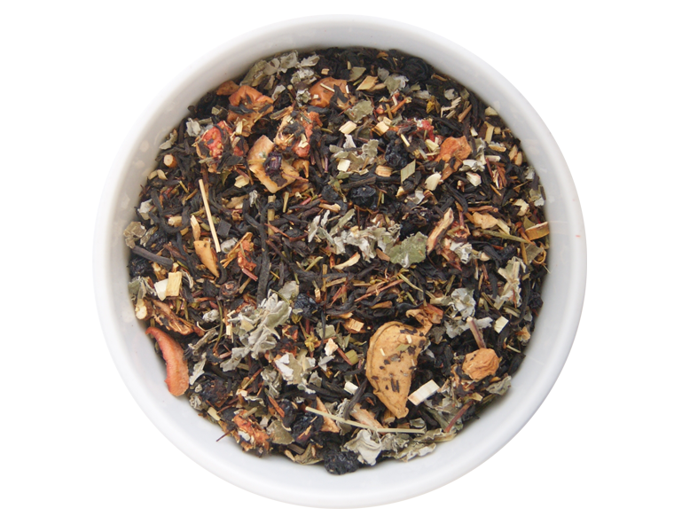 Ingrédients : Thé noir, honeybush vert, arômes, baies de sureau, morceaux de pomme, feuilles de framboisier, morceaux de fraise, cassis