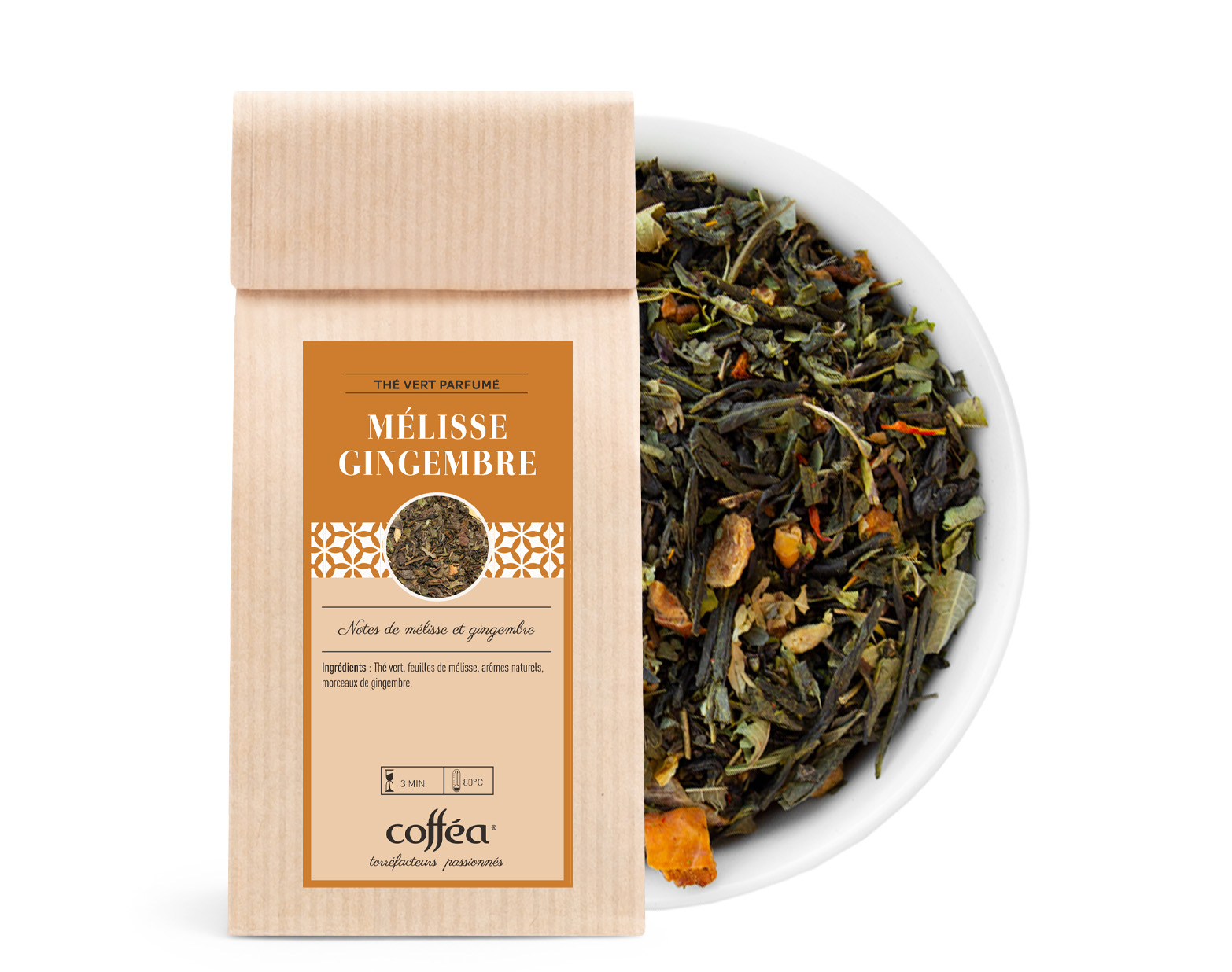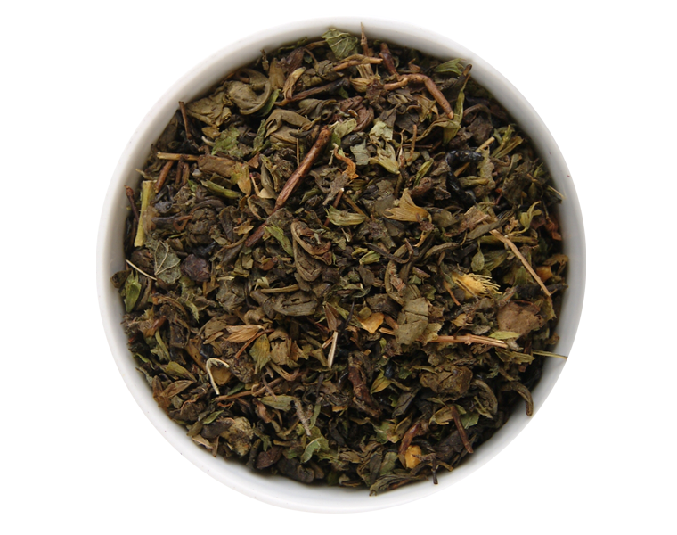 Ingrédients : Thé vert, feuilles de mélisse, morceaux de gingembre, arômes naturels