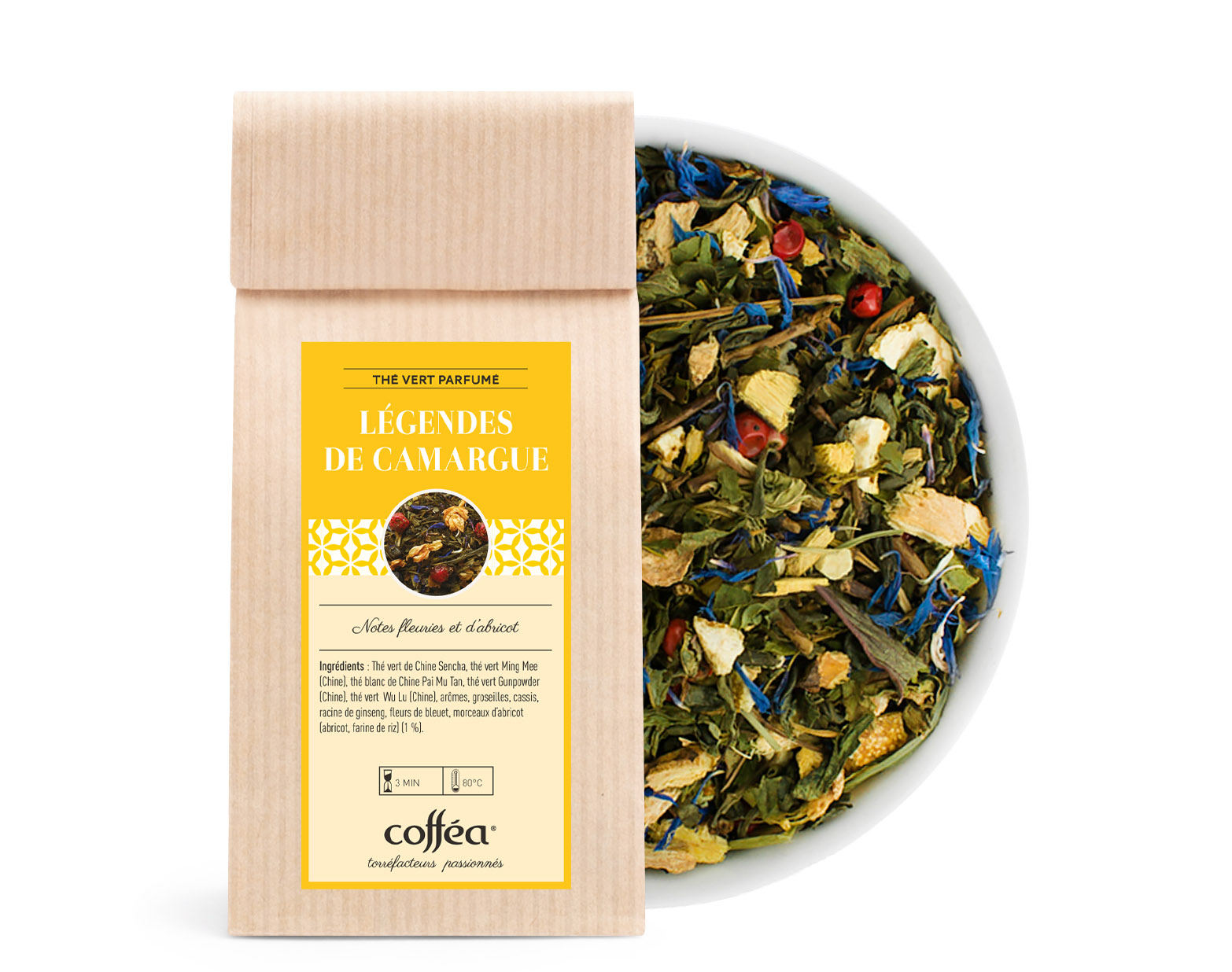 Le Thé Vert Légendes de Camargue combine des thés verts soigneusement sélectionnés, tels que le Sencha et le Ming Mee, avec des touches subtiles de thé blanc Pai Mu Tan, pour créer une infusion à la fois douce et rafraîchissante. Les morceaux d’abricot et les arômes floraux viennent équilibrer la saveur, tandis que la groseille, le cassis et la racine de ginseng apportent une dimension fruitée et légèrement épicée. Une véritable légende gustative à chaque gorgée.