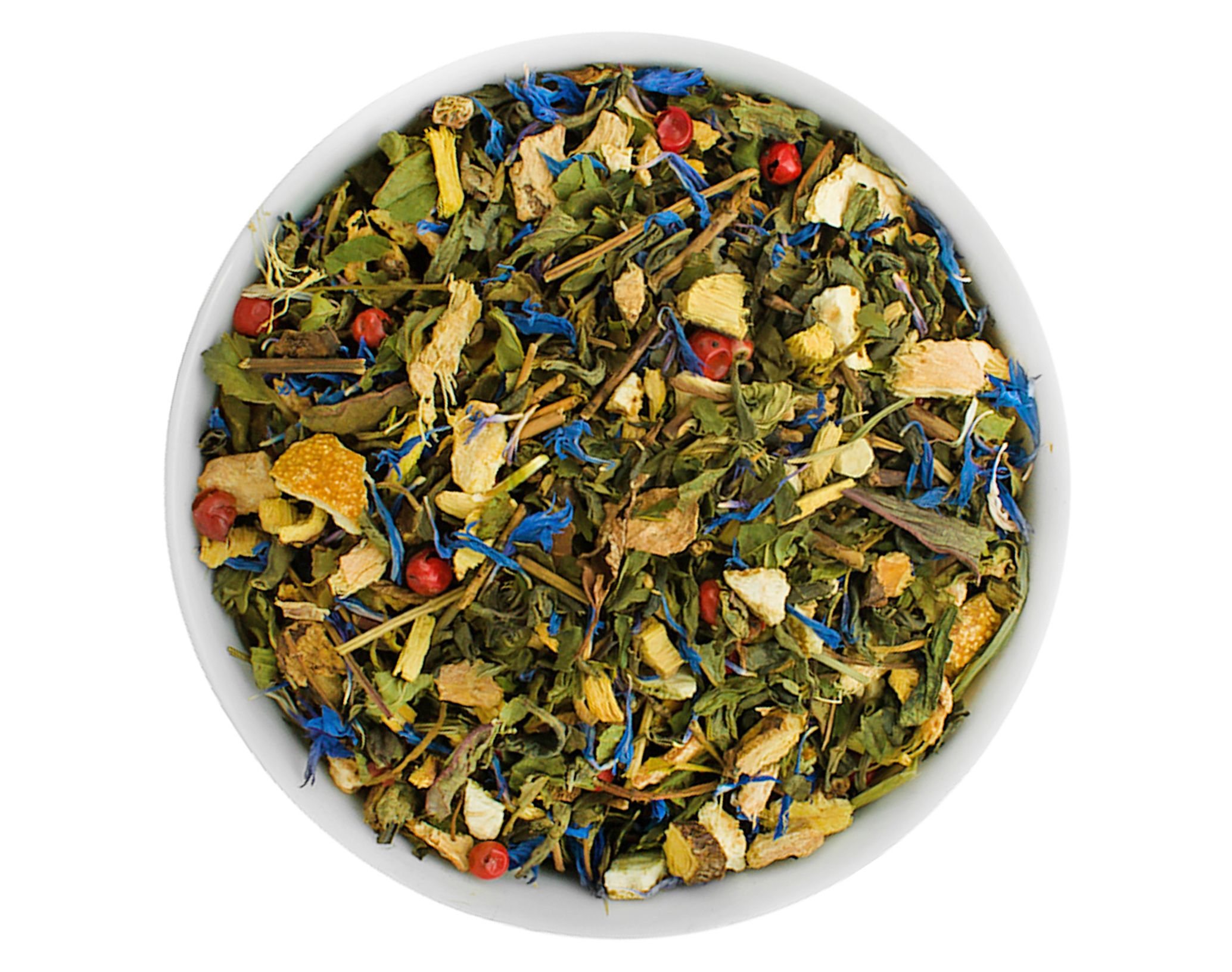 Ingrédients : Thé vert de Chine Sencha, thé vert Ming Mee, thé blanc Pai Mu Tan, thé vert Gunpowder, thé vert Wu Lu Fog, arômes, groseilles, cassis, racine de ginseng, fleurs de bleuet, morceaux d'abricot (abricot, farine de riz) (1 %).