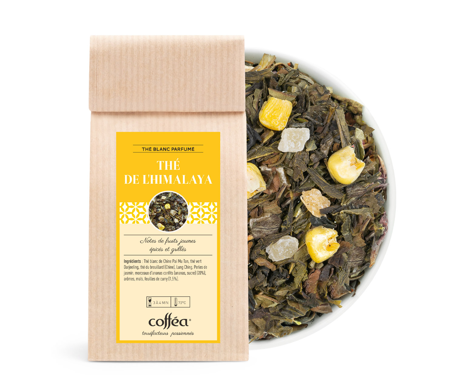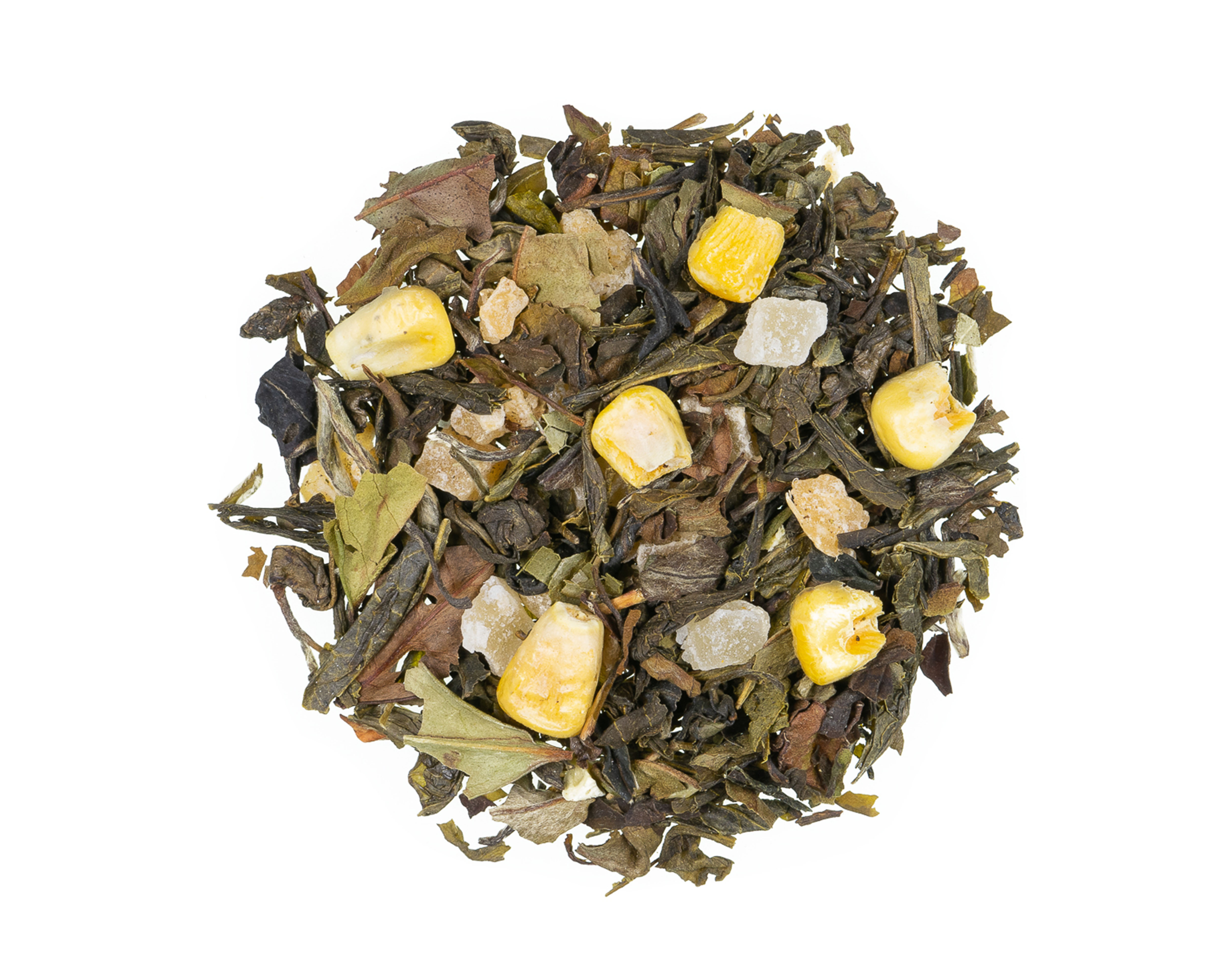 Thé blanc de Chine Pai Mu Tan, thé vert Darjeeling, thé vert Wu Lu Fog, Lung Ching, Perles de jasmin, morceaux d'ananas confits (ananas, sucre) (20%), arômes, maïs, feuilles de curry (1,5%).