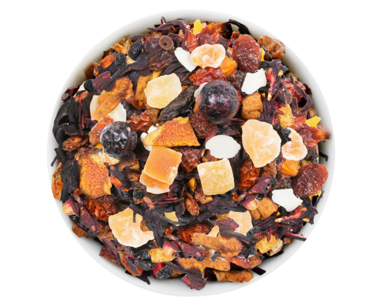 Ingrédients : Fleurs d’hibiscus, morceaux de pommes, raisins, écorces d’orange, écorces de cynorrhodon, morceaux d’ananas confit (ananas, sucre), baies de sureau, arôme, morceaux de papaye confite (papaye, sucre), amandes effilées, écorces de cannelle (1%), morceaux de vanille (0,5%), cassis.
