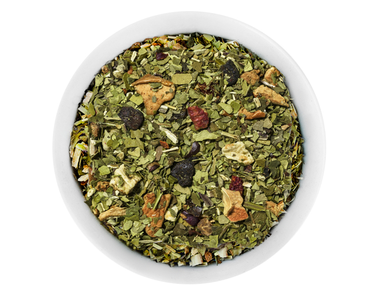 Maté vert (pour l’énergie et l’amertume végétale), morceaux de pomme (pour la douceur et le fondant), morceaux de goyave (pour la sucrosité exotique), écorces d’églantier (pour l’éclat fruité et acidulé), feuilles de mûre douce (pour la note fruitée et veloutée), racine de chicorée (pour la profondeur torréfiée), graines de guarana (pour l’effet stimulant et tonifiant), morceaux de cerise (pour la touche gourmande et fruitée), arôme naturel (pour sublimer l’ensemble).