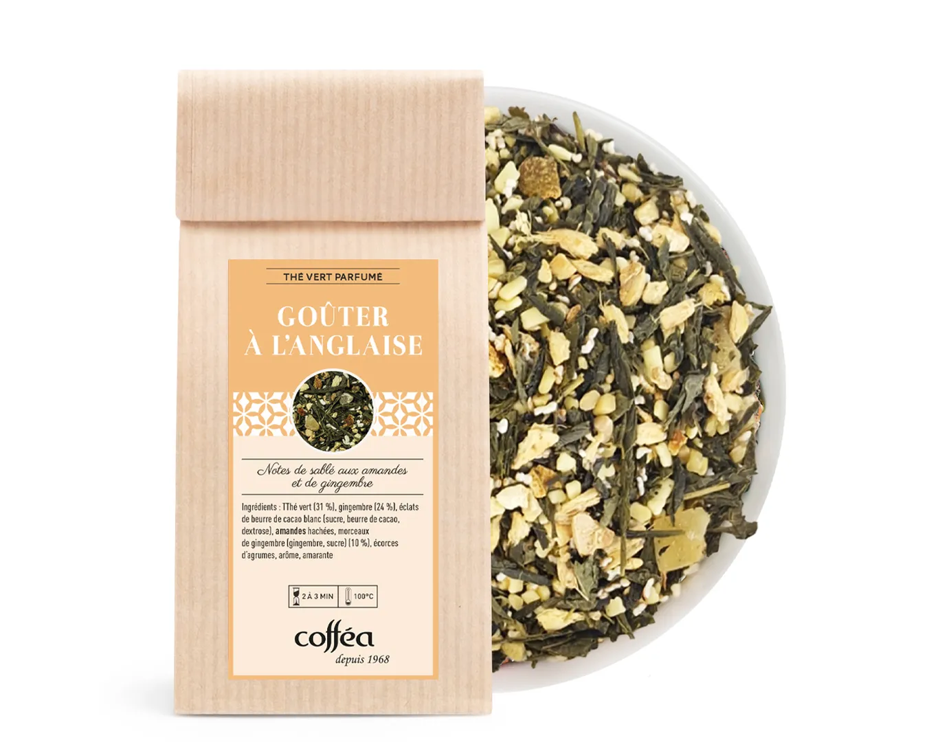 Composition : Thé vert (31 %), gingembre (24 %), éclats de beurre de cacao, amandes hachées, gingembre confit (10 %), écorces d’agrumes, arôme naturel, fleurs d’amarante.