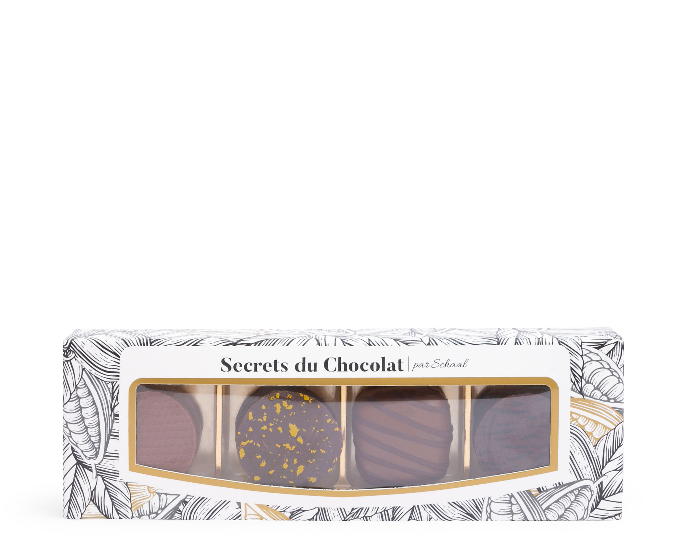 Un écrin élégant renfermant quatre bouchées chocolatées, pour une pause gourmande tout en finesse. Chaque bonbon est une invitation à la découverte : praliné, ganache, croustillant ou caramel — laissez-vous surprendre par des textures onctueuses et des arômes délicats, travaillés avec soin par un maître chocolatier.