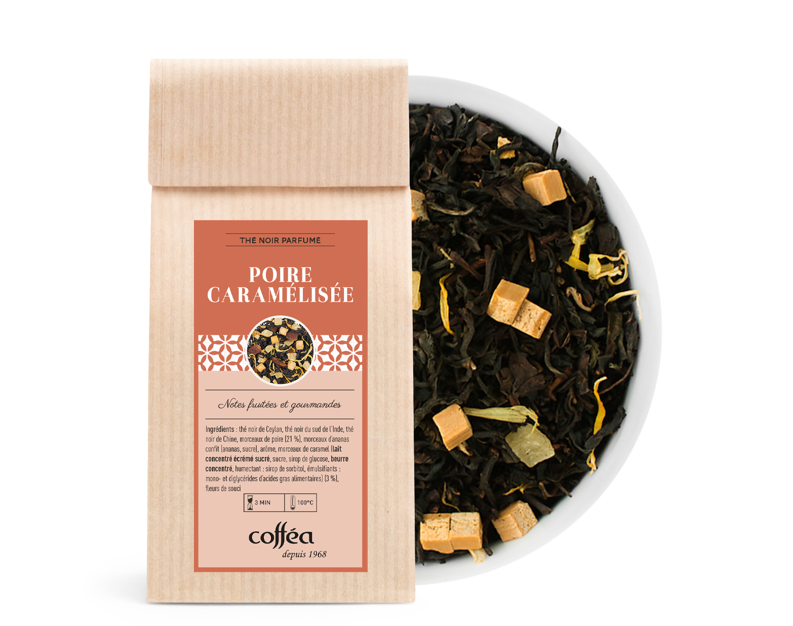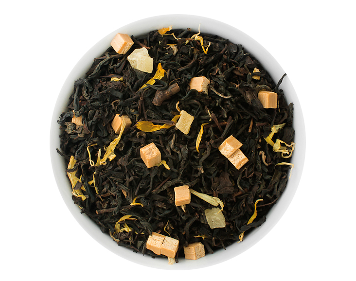 Ingrédients : Thé noir de Ceylan, thé noir du sud de l’Inde, thé noir de Chine, morceaux de poire (21%), morceaux d’ananas confit (ananas, sucre), arôme, morceaux de caramel (lait concentré écrémé sucré, sucre, sirop de glucose, beurre concentré, humectant : sirop de sorbitol, émulsifiants : mono- et diglycérides d’acides gras alimentaires) (3%), fleurs de souci.