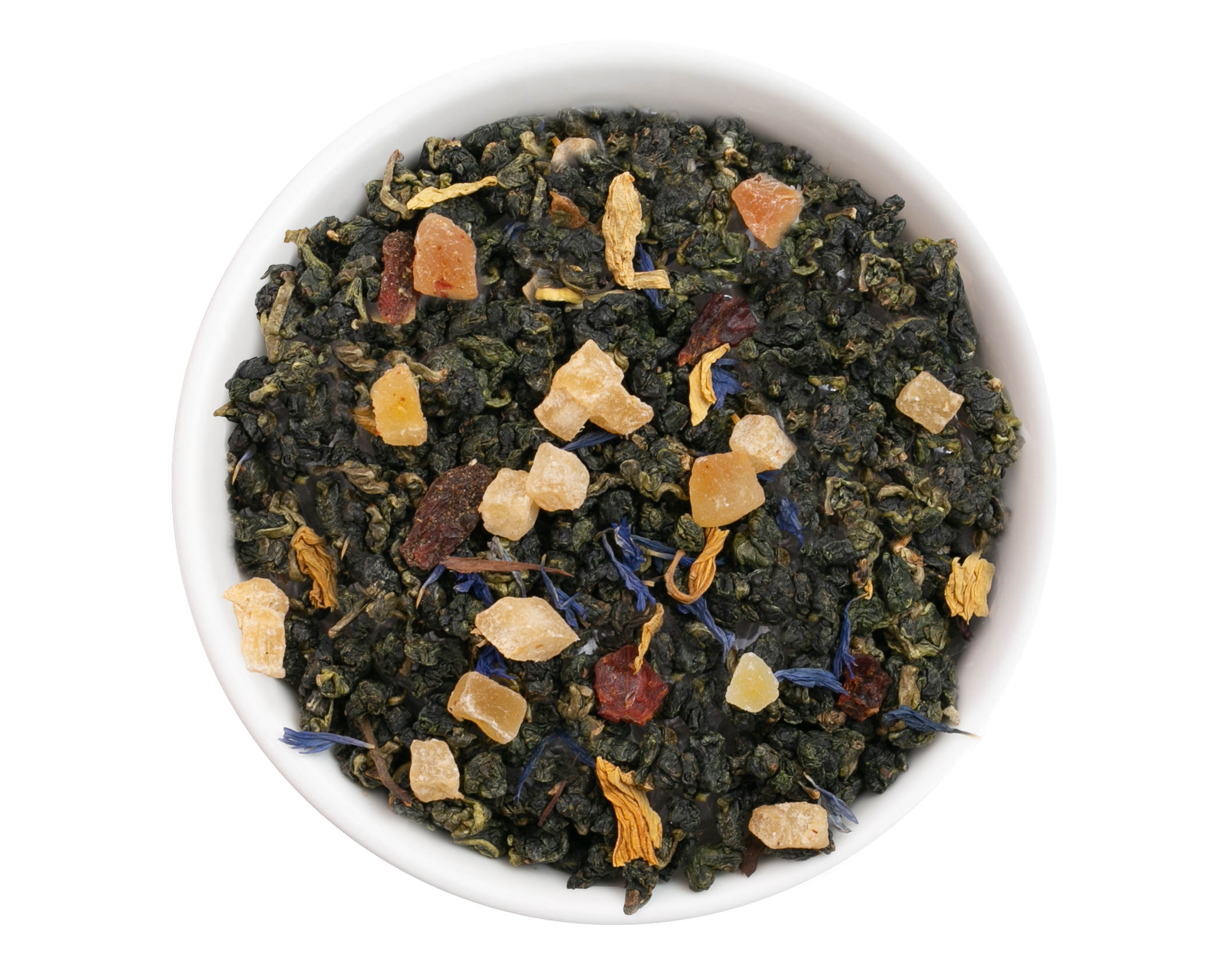 Ingrédients : Thé partiellement fermenté (40 %), morceaux de papaye confite (papaye, sucre), baies de goji (7 %), arômes, morceaux de figues (figue, farine de riz), morceaux de pêche (pêche, farine de riz) (1,9 %), pétales de souci, fleurs de bleuet.