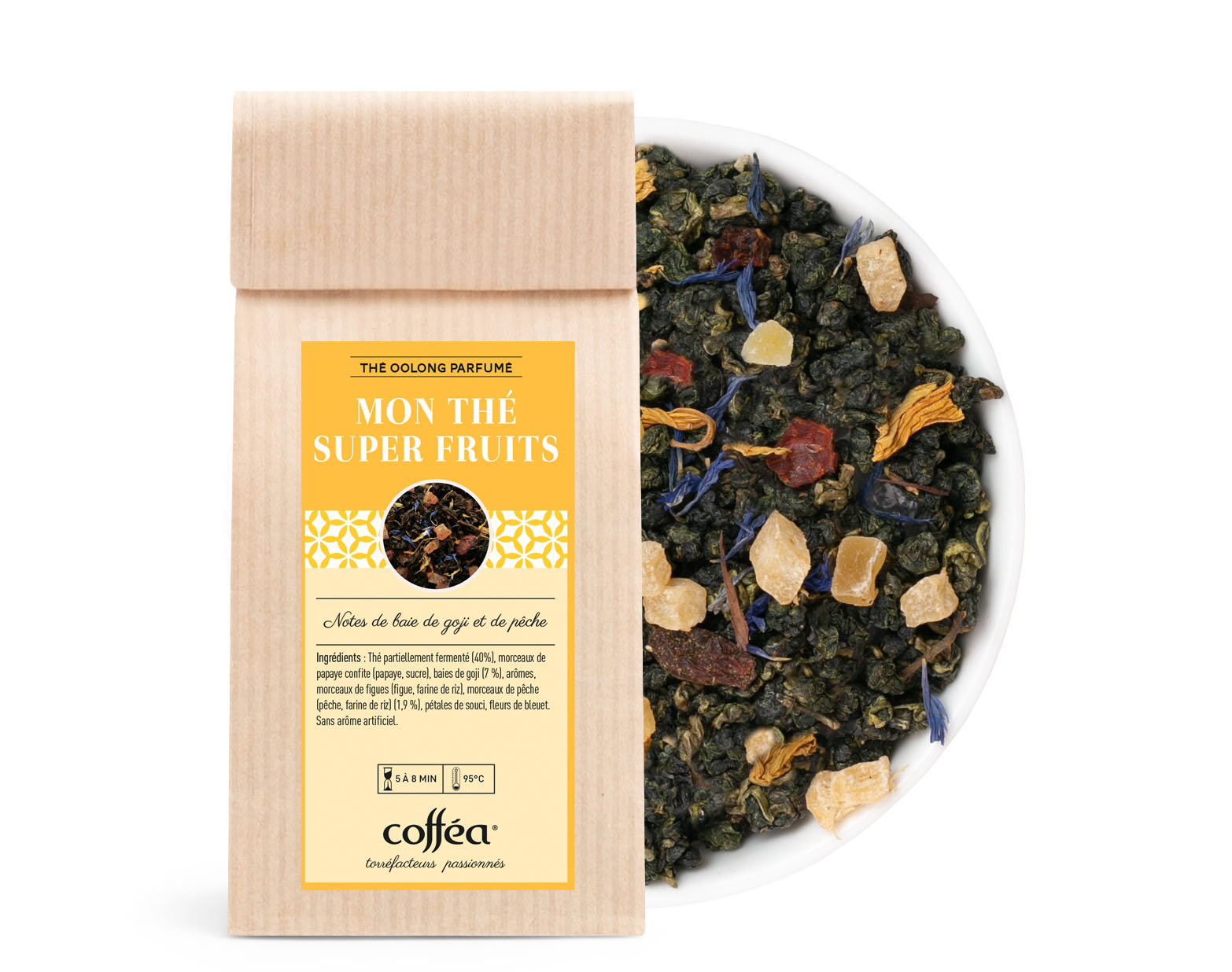 Ce Thé Oolong Mon Thé Super Fruits, partiellement fermenté à 40 %, offre une alliance parfaite entre la douceur fruitée et les bienfaits naturels des super-fruits. Sa base de thé Oolong, réputée pour sa richesse aromatique, est sublimée par des morceaux de pêche juteuse, de papaye confite et de figues gourmandes, le tout rehaussé par les baies de goji, connues pour leurs propriétés revitalisantes.