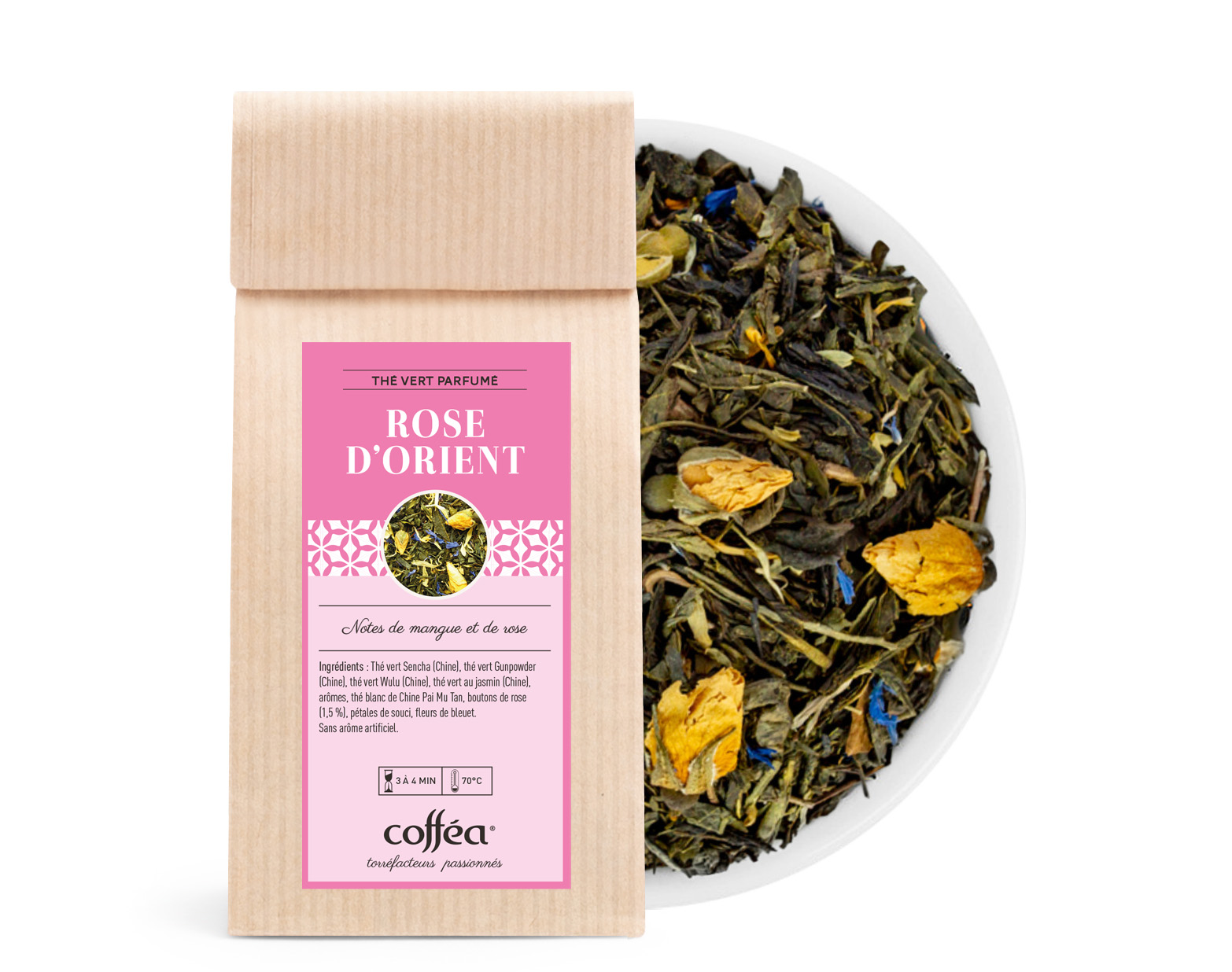 Le Thé Vert Rose d’Orient est une création raffinée alliant des thés verts d’exception (Sencha, Gunpowder, Wu Lu Fog, Jasmin) et un thé blanc délicat (Pai Mu Tan) à des fleurs parfumées et des arômes subtils de mangue et de rose. Chaque tasse invite à une promenade sensorielle entre vergers exotiques et jardins fleuris de l’Orient.