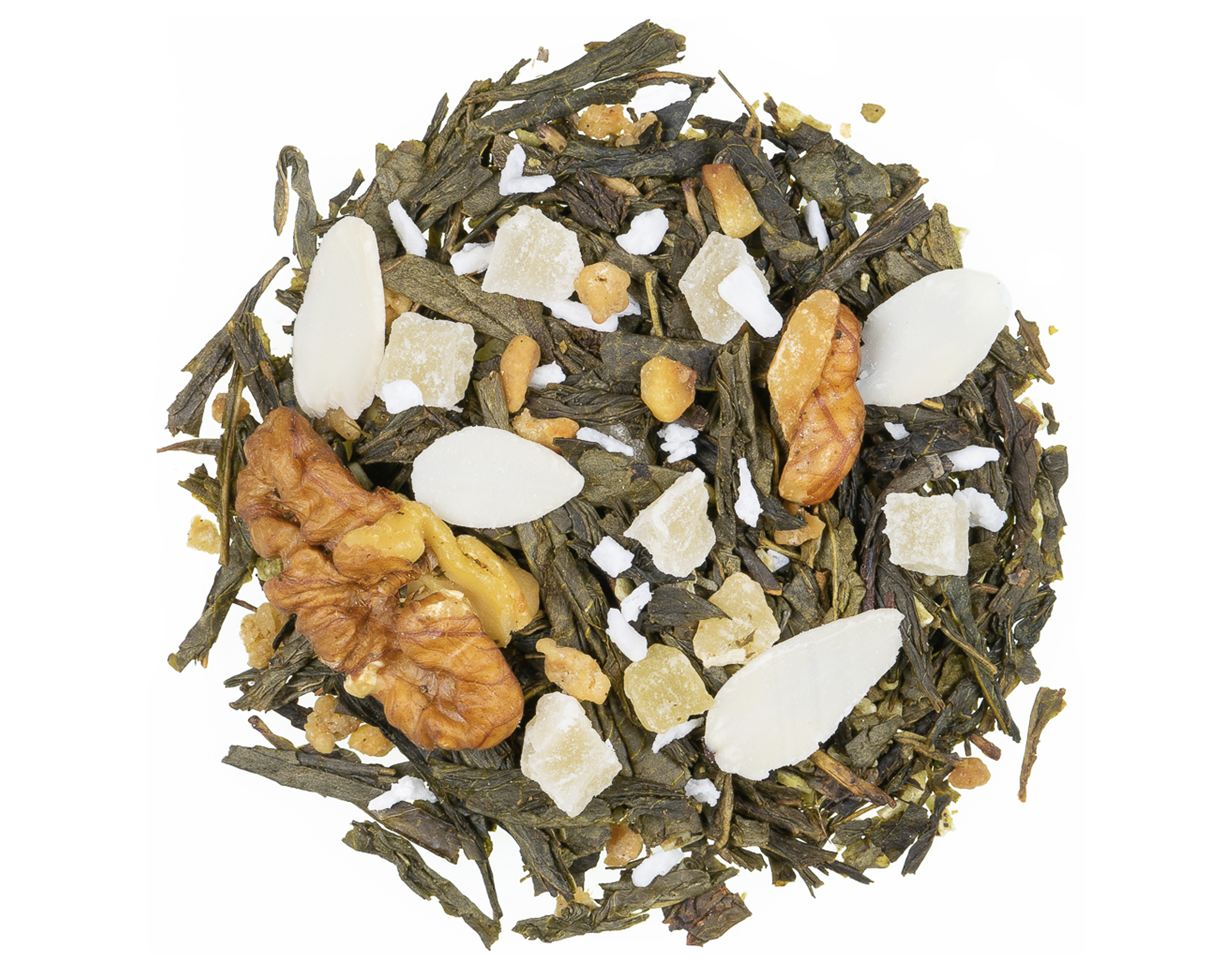 Ingrédients : Thé vert Sencha (Chine), morceaux de nougatine (sucre, noisettes), morceaux d’ananas confit (ananas, sucre), noix de coco râpée, cerneaux de noix (6%), arômes, amandes effilées.