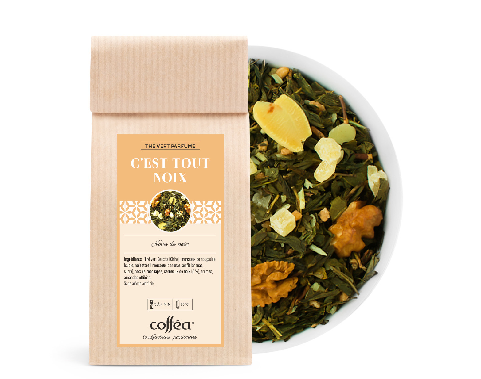 Le Thé vert C'est tout noix surprend par sa richesse en saveurs et sa douceur veloutée. Composé de thé vert Sencha, de morceaux de nougatine, d’ananas confit, de noix de coco râpée, et de cerneaux de noix, ce thé crémeux et fruité combine une palette de nuances sucrées, florales et légèrement noisetées. Dès la première gorgée, on est transporté dans un monde d'arômes réconfortants, parfait pour se détendre à tout moment de la journée. Ce thé se prête aussi parfaitement à une dégustation glacée en été, pour des moments de fraîcheur et de douceur.