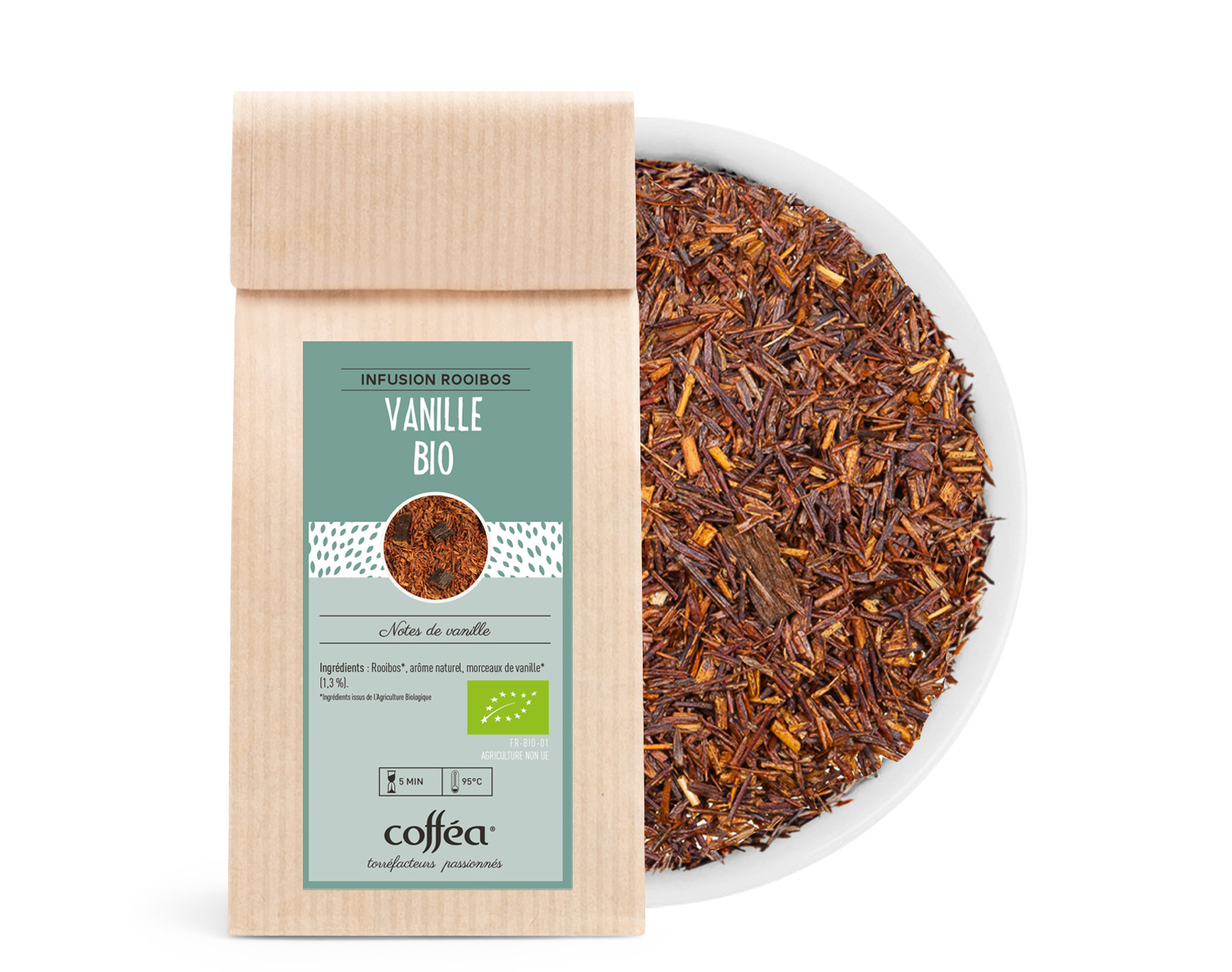 Ingrédients : Rooibos* (98,7 %), arôme naturel, morceaux de vanille* (1,3 %) *Ingrédients issus de l’Agriculture Biologique