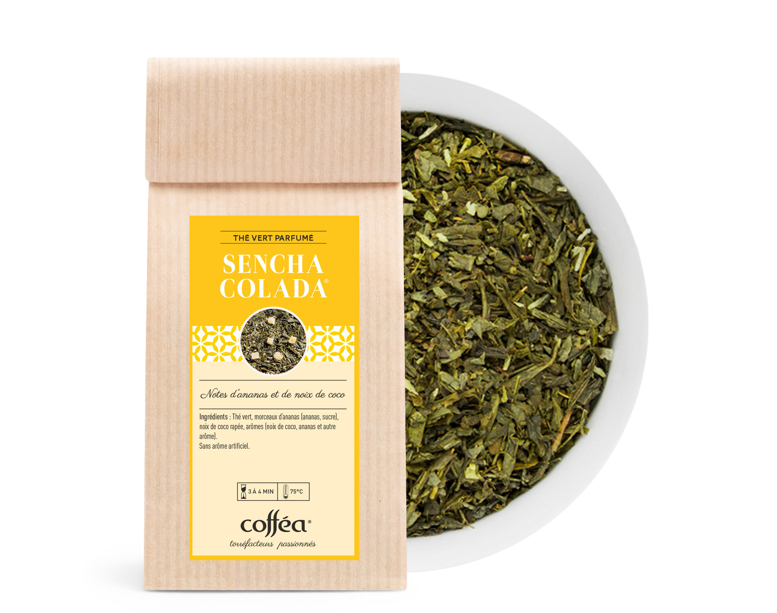 Liste des ingrédients :Thé vert, morceaux d’ananas (ananas, sucre), noix de coco râpée, arômes (noix de coco, ananas et autre arôme).