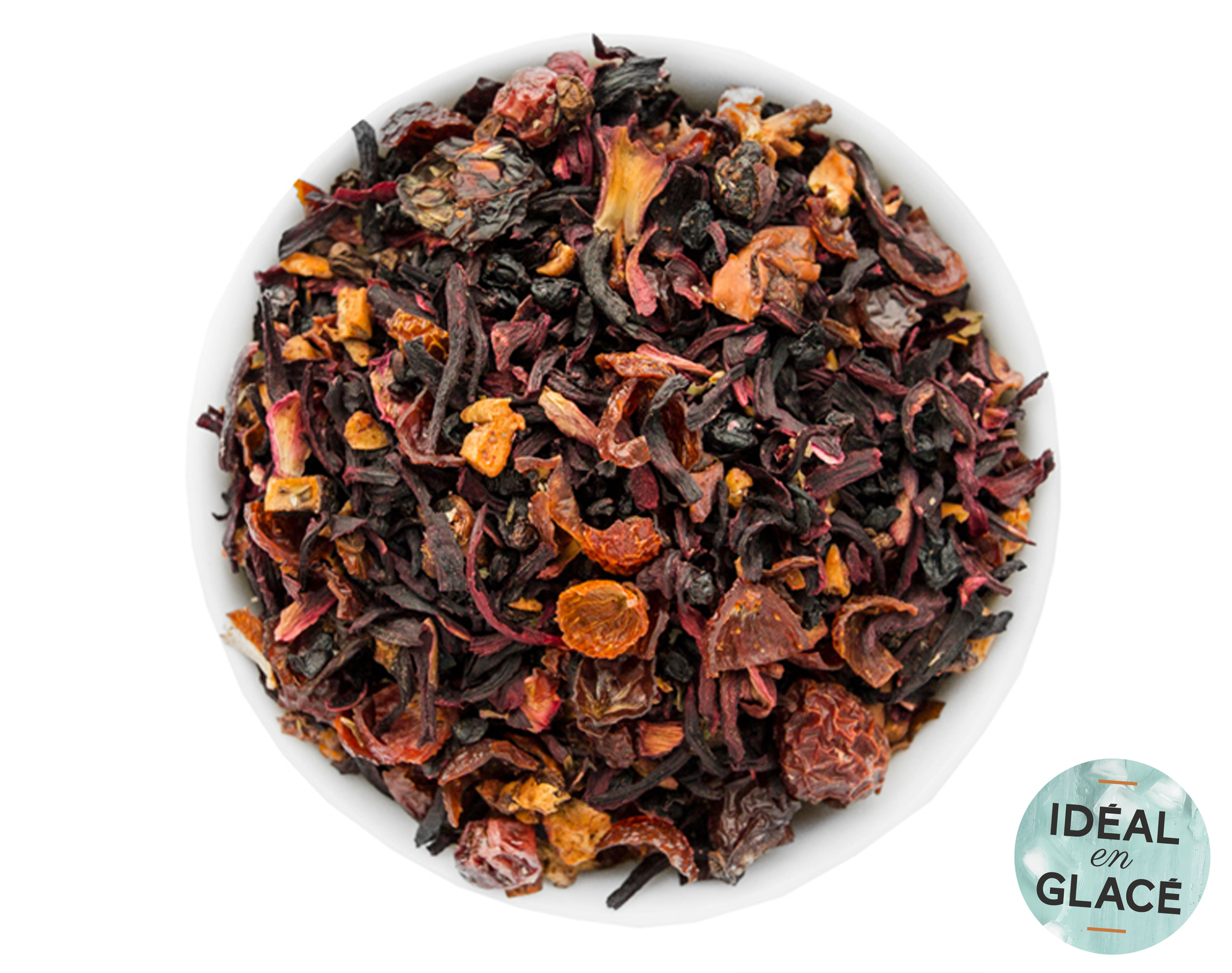Ingrédients : Hibiscus, cynorhodon, baies de sureau, morceaux de pomme, arômes, framboises (1,5 %), groseilles (1,5 %), myrtilles, feuilles de fraisier