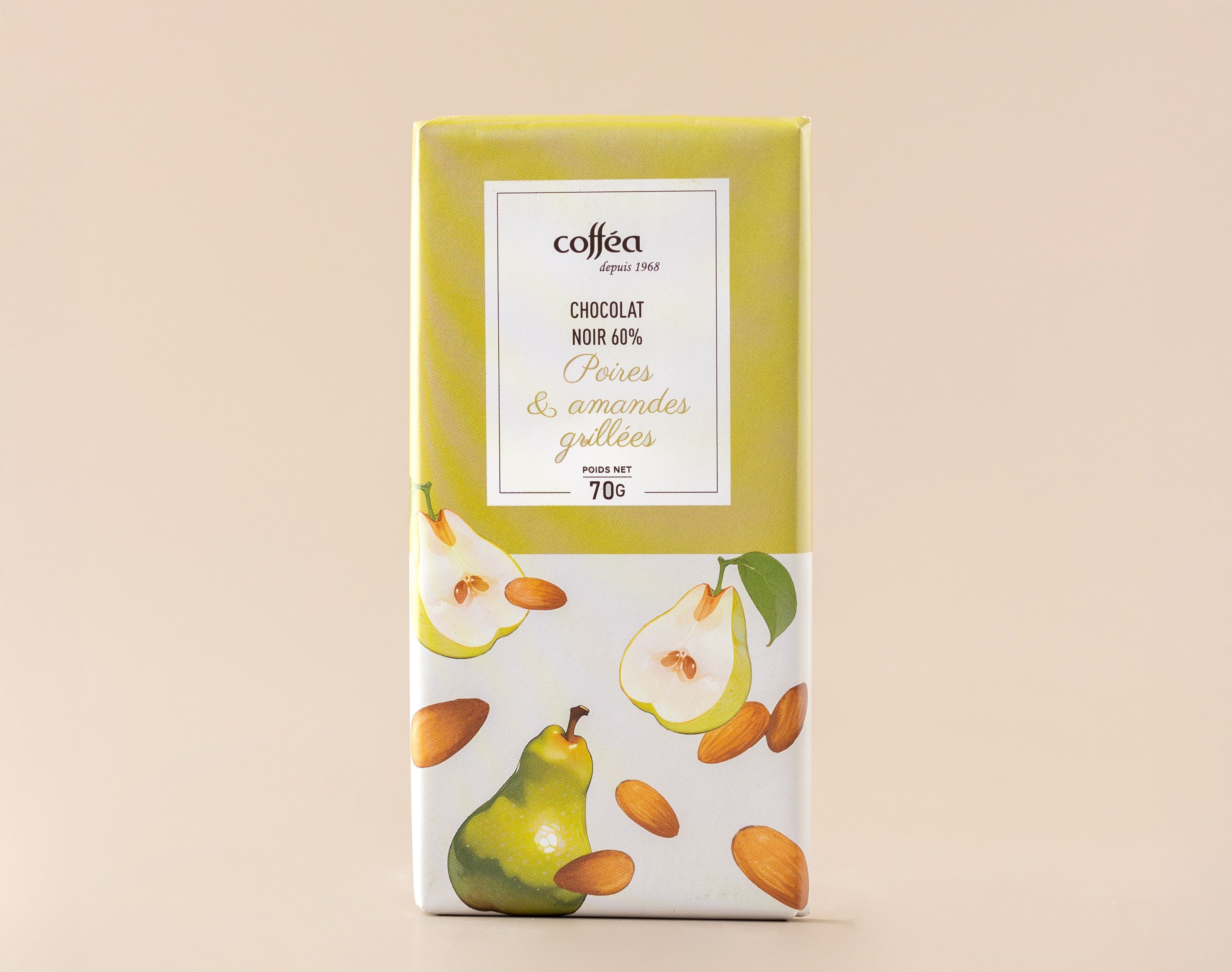 Inspirée des mariages classiques de la pâtisserie, cette tablette réunit des ingrédients emblématiques de la gourmandise : la poire, délicate et juteuse, et l’amande, subtilement grillée pour révéler ses arômes. Une création qui évoque les saveurs des desserts traditionnels tout en offrant une expérience chocolatée unique et raffinée.