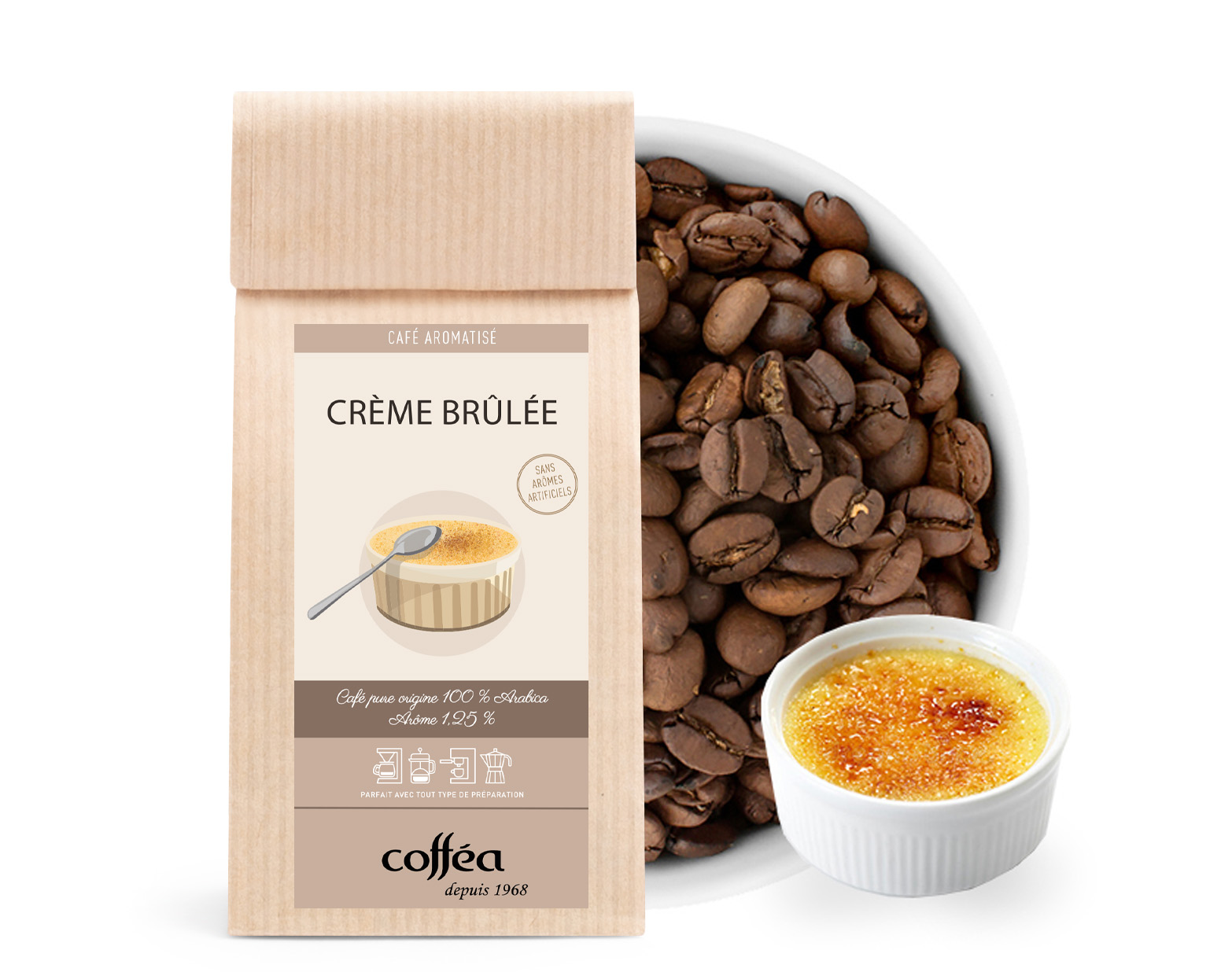 Le Café Grains Aromatisé Crème Brûlée est un véritable voyage gourmand qui s’inspire de l’un des desserts français les plus appréciés. Ce café Arabica, composé de grains brésiliens et colombiens, offre une combinaison sophistiquée de crème vanille, de douceur de caramel noir et de la tendresse de vanille, parfaitement équilibrée avec la délicate amertume du café.