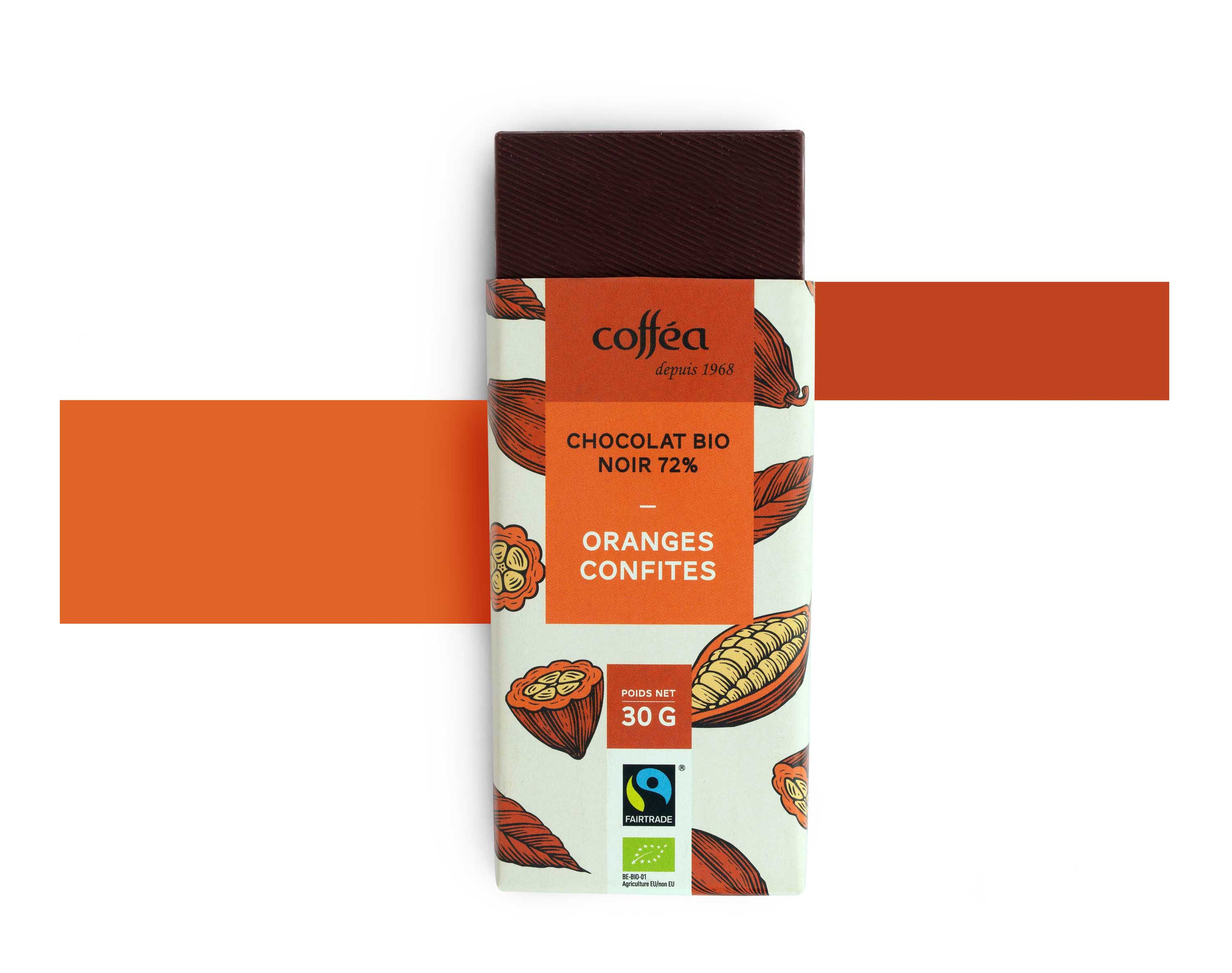 Liste des ingrédients : Masse de cacao*, sucre de canne*, beurre de cacao*, cubes d’écorces d’oranges confites* (4%), (sirop d’amidon de maïs*, écorce d’orange* , sel de mer), poudre de vanille *, arôme naturel d’orange Teneur minimum en cacao : 72%. Allergènes : Peut contenir des traces de fruits à coque, de soja, de lait, d’oeufs, de sésame et de gluten.