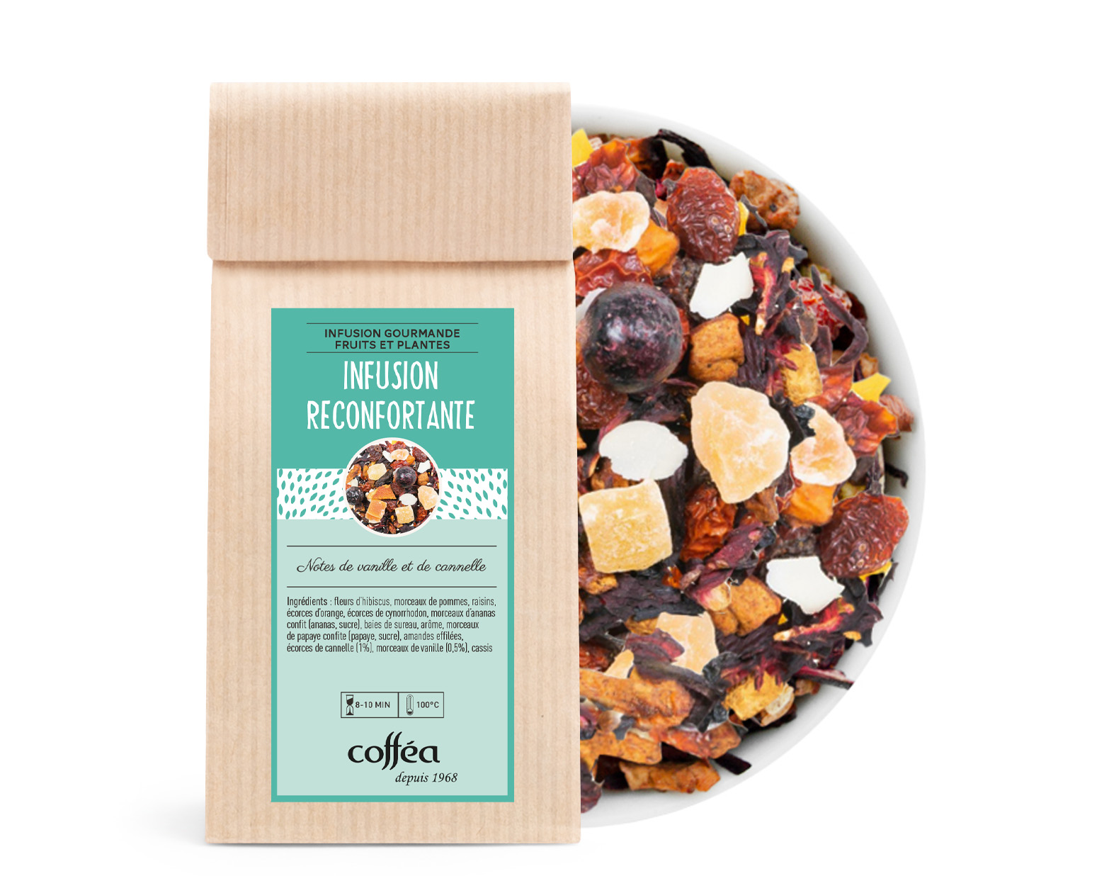 L'Infusion Réconfortante est une boisson riche et apaisante, idéale pour ceux qui recherchent une expérience gustative douce et réconfortante. Elle combine des saveurs sucrées et acidulées, avec des morceaux de pommes, de raisins secs, d’ananas confit et de papaye confite. Les fleurs d'hibiscus et les baies de sureau apportent une légère acidité qui équilibre la douceur des fruits exotiques, tandis que les amandes effilées et les écorces de cannelle ajoutent des notes chaleureuses et légèrement épicées. Un soupçon de vanille et de cassis enrichit l'ensemble, offrant une infusion complète et agréable. Avec son arôme chaleureux et apaisant, cette infusion est idéale pour bien démarrer la journée ou pour savourer une boisson réconfortante en fin de soirée.