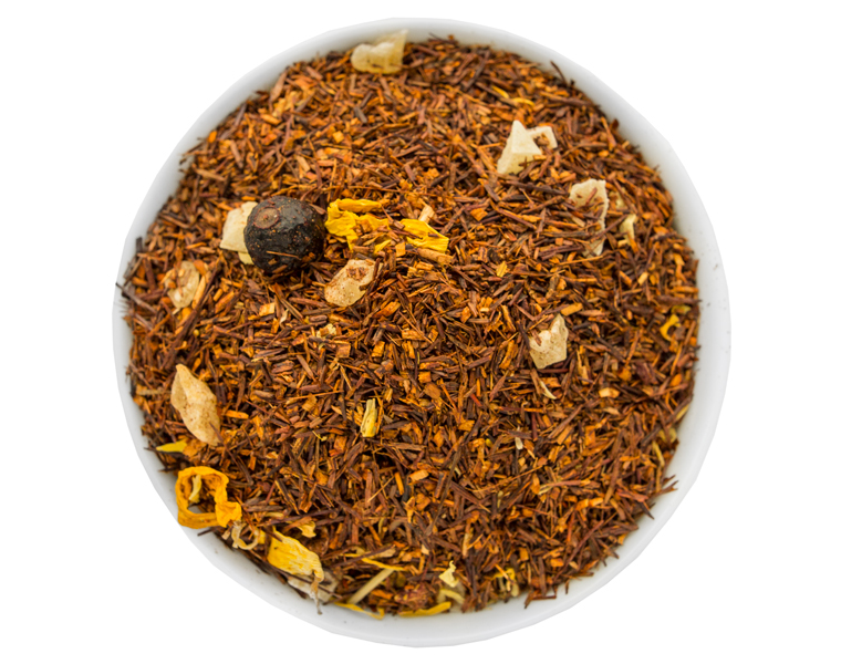 Ingrédients : Rooibos, morceaux d’ananas confit (ananas, sucre), arômes, morceaux de papaye confite (papaye, sucre), morceaux de mangue confite (mangue, sucre), cassis (1,5%), pétales de tournesol, morceaux de fraises, framboises (1%).