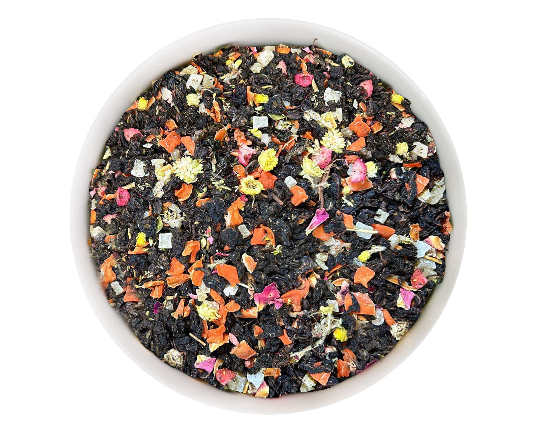 Ingrédients : Thé oolong, morceaux de carotte, morceaux d’ananas confit (ananas, sucre), morceaux de papaye confite (papaye, sucre), arôme naturel, herbe douce, fleurs de pied de chat, pétales de rose, morceaux de canneberge, morceaux de litchi (0,5 %).