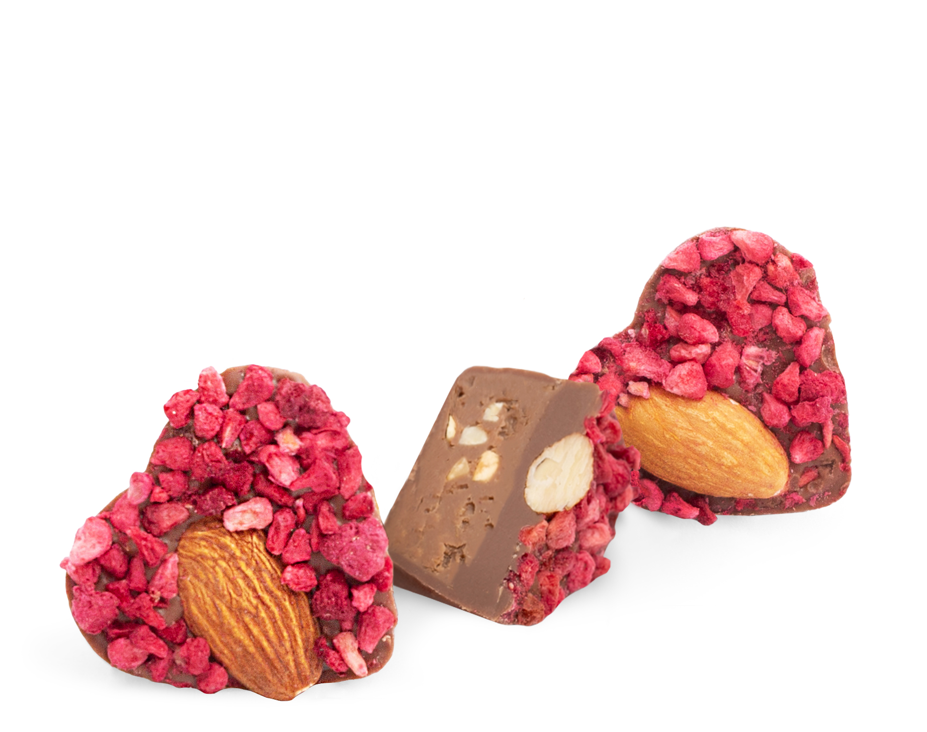 pâte de noix d’amande, amandes entières grillées, framboises lyophilisées,
