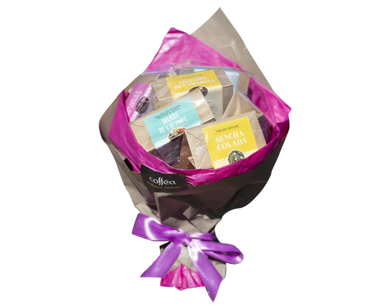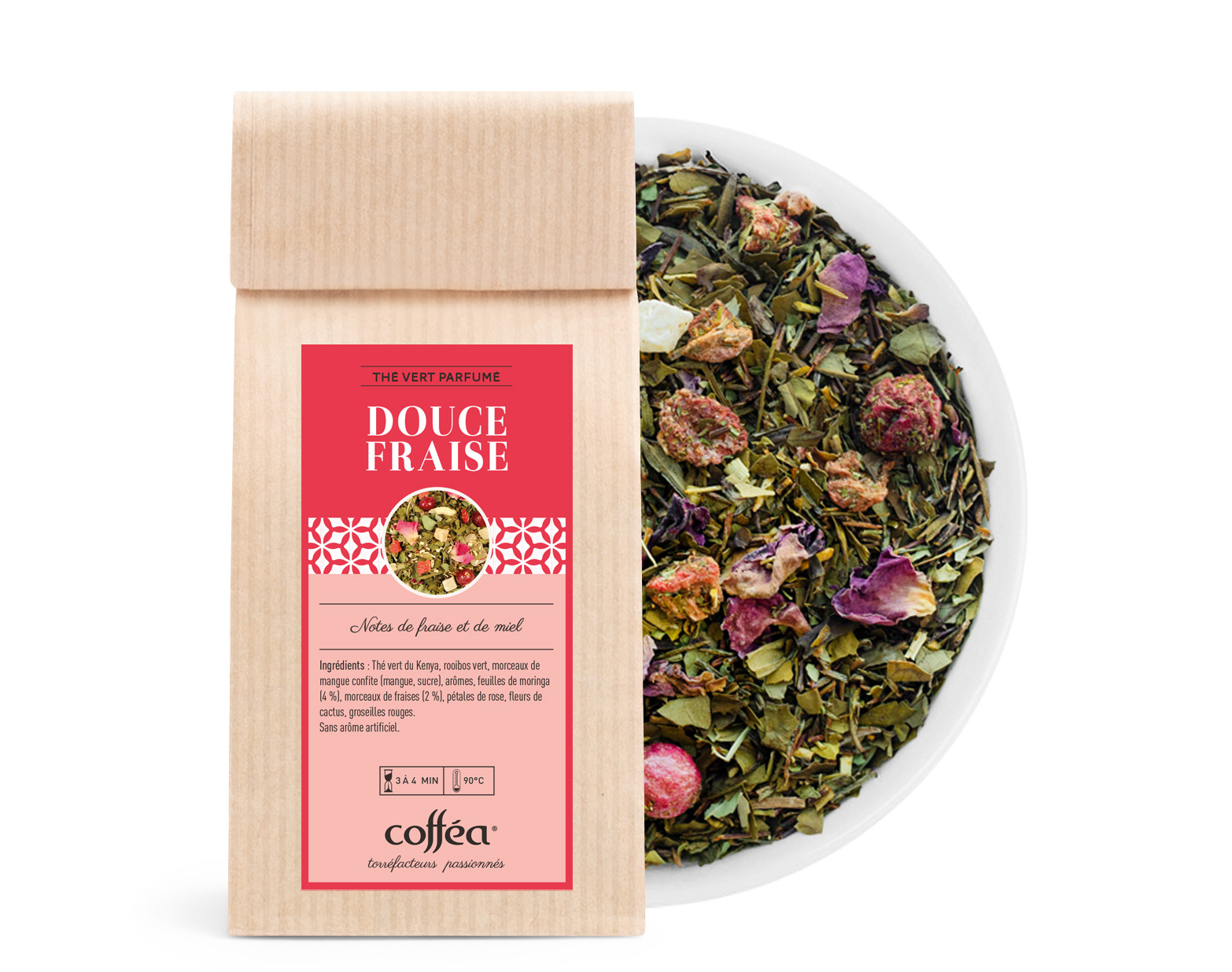 - Thé vert Douce fraise : Thé vert du Kenya, rooibos vert, morceaux de mangue confite (mangue, sucre), arômes, feuilles de moringa (4 %), morceaux de fraises (2 %), pétales de rose, fleurs de cactus, groseilles rouges.
