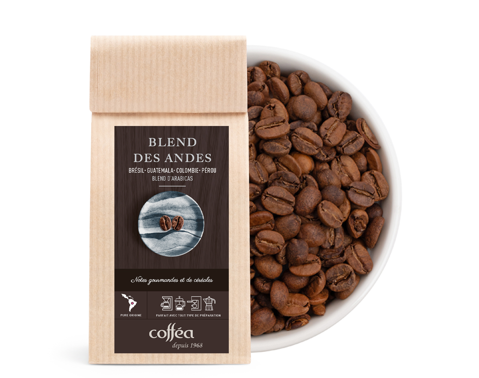 Rondeur, céréales et douceur andine. Un assemblage 100 % arabica issu des hauts plateaux d’Amérique du Sud : Brésil, Guatemala, Colombie et Pérou.