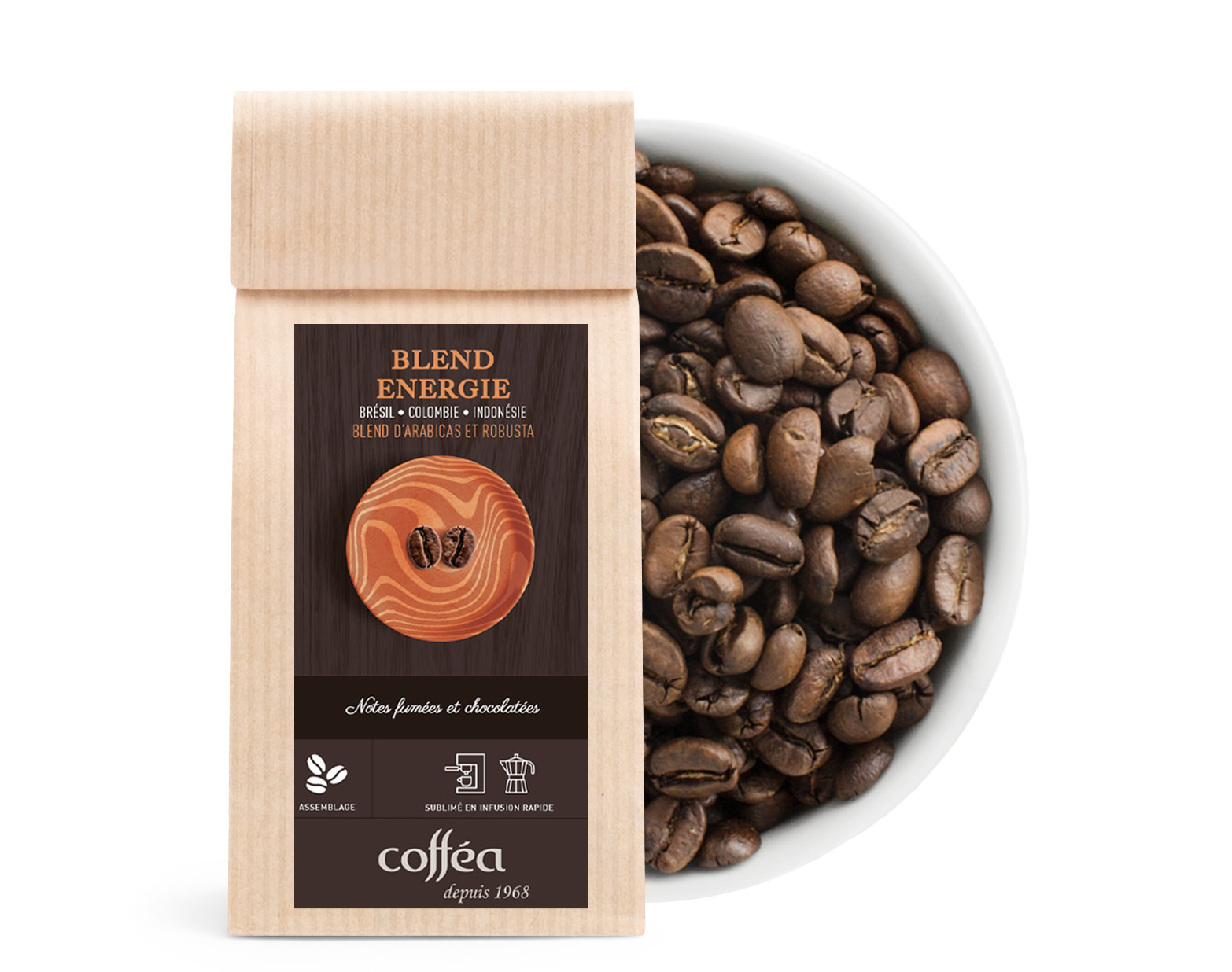 Ce blend Énergie, marie avec audace des arabicas doux et fruités du Brésil et de Colombie à un robusta corsé d’Indonésie, pour un café tonique, équilibré et profondément aromatique. Au nez, des effluves de cacao torréfié, de bois grillé et de caramel. En bouche, une attache puissante et veloutée, où se mêlent des notes de chocolat noir, de noisette torréfiée et une pointe de fumée, le tout porté par une belle longueur en bouche. Sublimé en infusion rapide, ce blend libère toute sa complexité et son énergie, pour un moment caféiné et réconfortant.