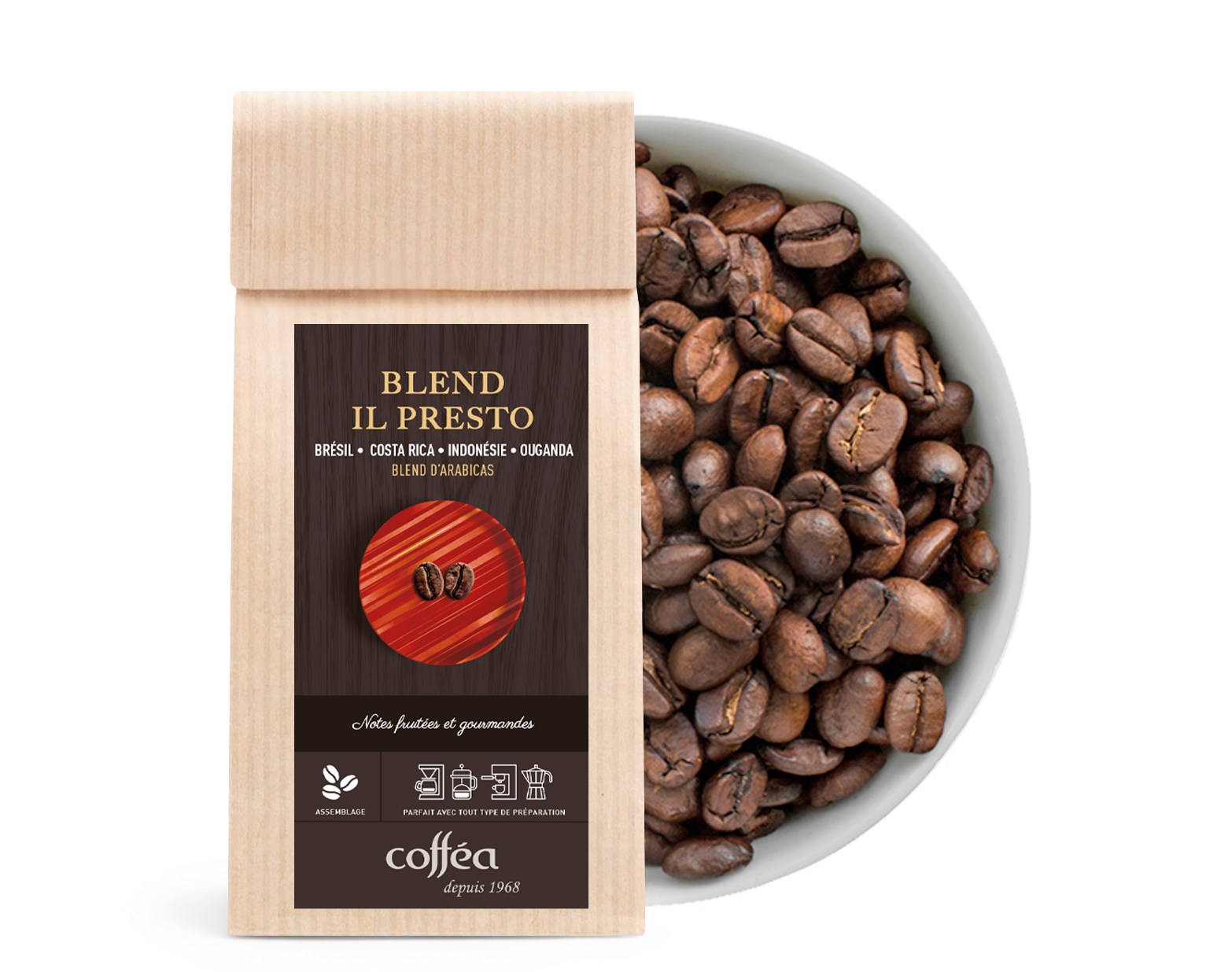 Origine : Blend "Il Presto" – Brésil Cerrado, Costa Rica,Indonésie, Ouganda AA.