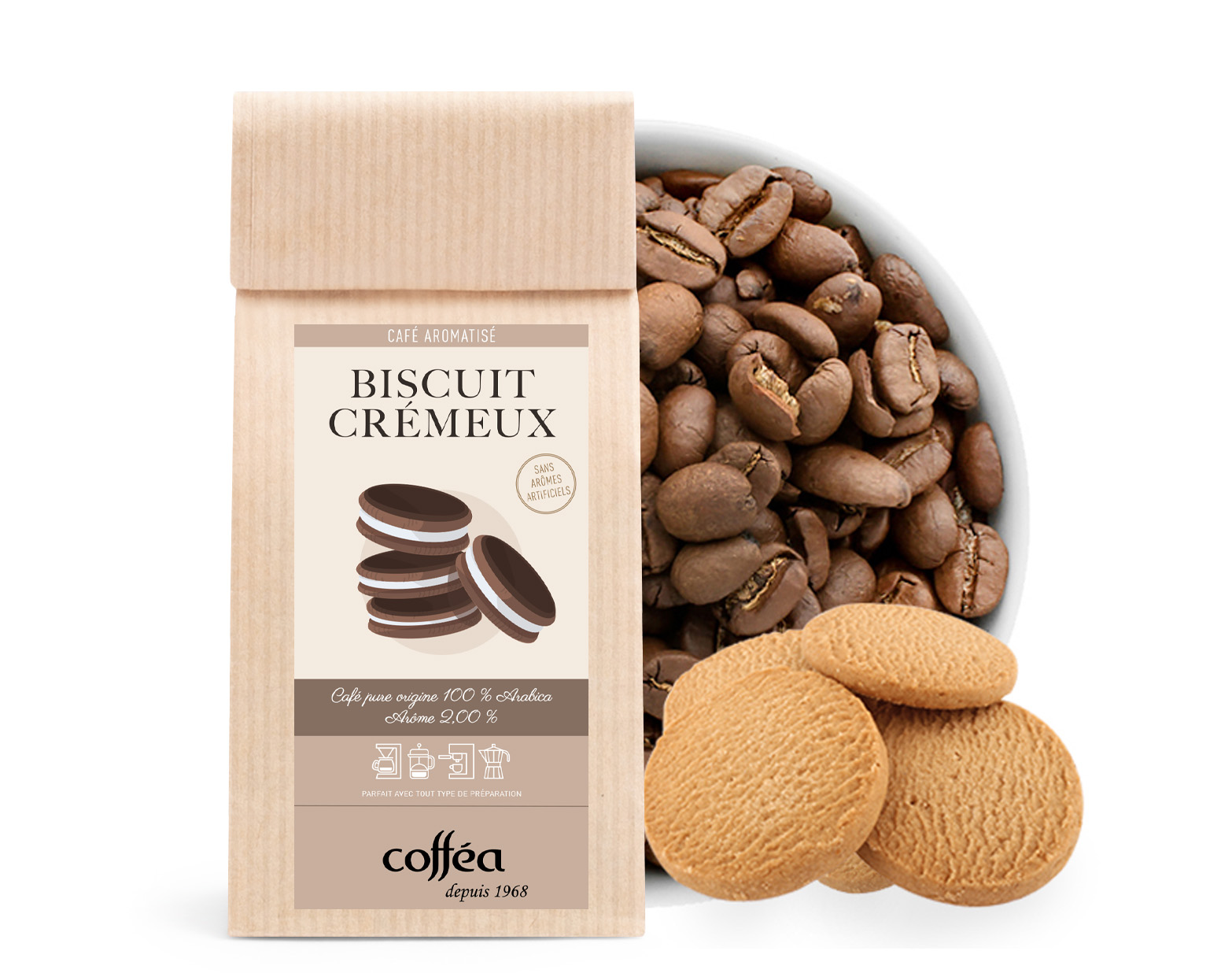 Le Café Grains Aromatisé Biscuits Crémeux offre une tasse délicieusement parfumée avec des notes de sablé, de noix, et de lait cuit à la vapeur. Ce café Arabica, composé de grains brésiliens et colombiens, révèle un goût équilibré et gourmand, sublimé par la douceur du lait fondu et la chaleur de la vanille.