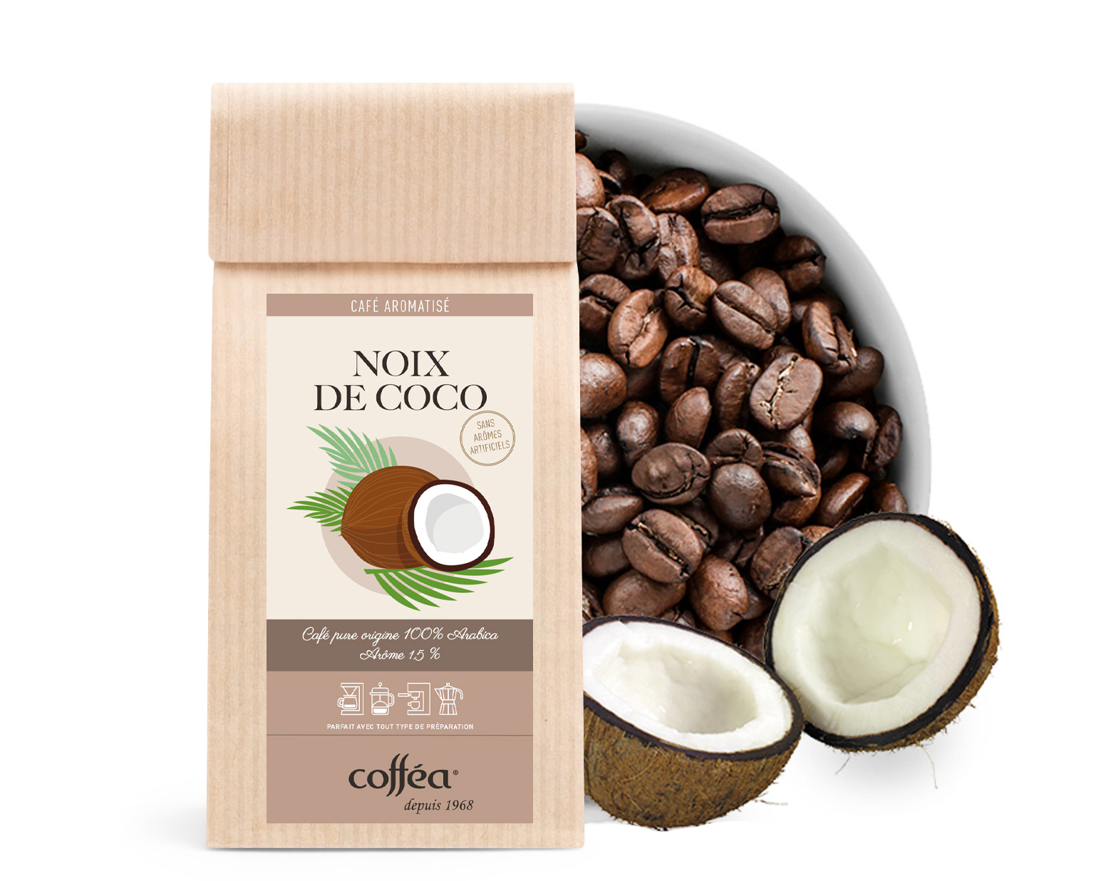 Le Café Grains Aromatisé Noix de Coco est une invitation au voyage avec son arôme délicat de noix de coco qui se marie parfaitement avec le goût riche et équilibré du café. Ce café Arabica, issu de Brésil et Colombie, combine l’exotisme de la noix de coco à la profondeur de l'Arabica brésilien, créant une boisson douce et gourmande.
