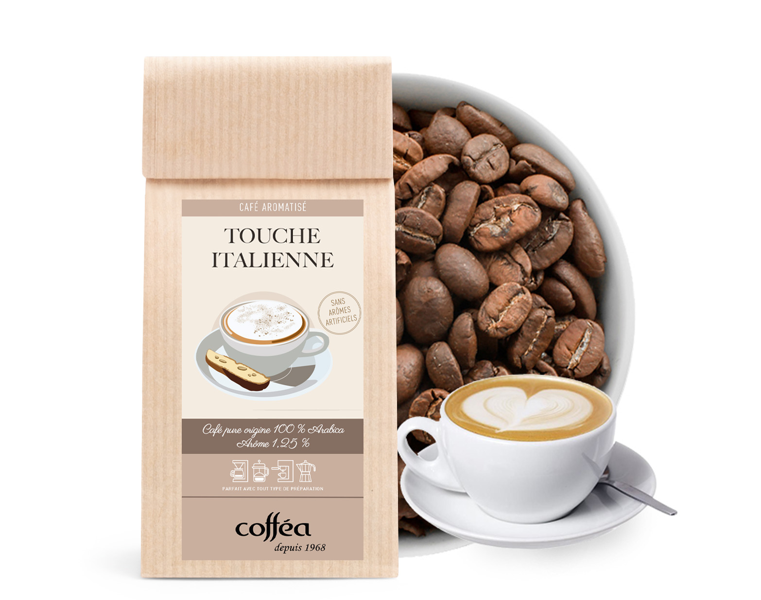 Le Café Grains Aromatisé Touche Italienne incarne la passion et l'élégance de l’Italie. Corsé, aéré et crémeux, il fait penser aux célèbres cappuccinos italiens, doux et sucrés, avec une texture légère et un goût délicat. Ce café est élaboré à partir d'un mélange d'Arabicas brésiliens et colombiens, des variétés de café incontournables dans l’élaboration de l'espresso italien.