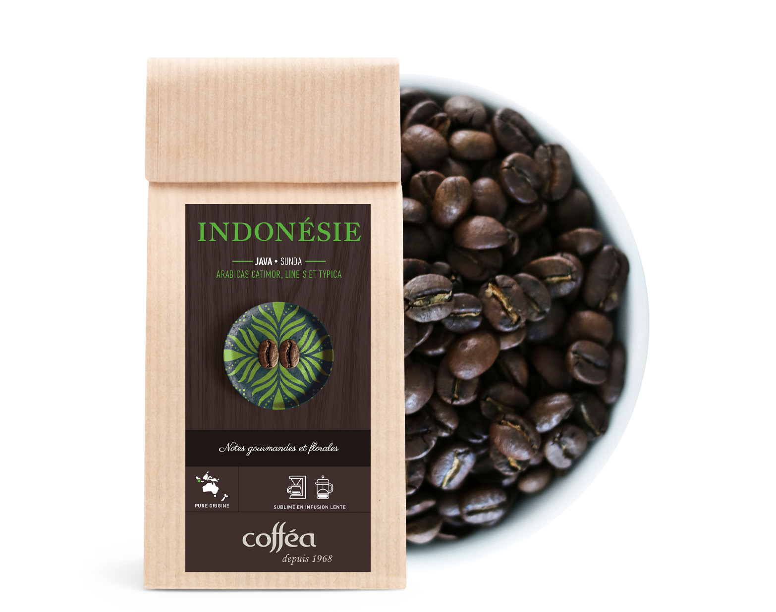 LE TERROIR : Avec plus de 300 ans d'histoire du café, la compagnie des Indes Néerlandaise a laissé sa trace en Indonésie avec ses premières plantations. Redécouvertes dans les hautes altitudes de la région de Sunda, ces plantations d'origines ont conservé une ancienne variété le typica vieux de près de 100 ans. Près de 90 hectares de cette variété typica poussent sous les forêts de pins, eucalyptus et d'autres essences. Ces plantations sont exploitées de façon participative par les producteurs de la région. Véritable graine de caractère, ce café développe aujourd'hui une typicité à part.