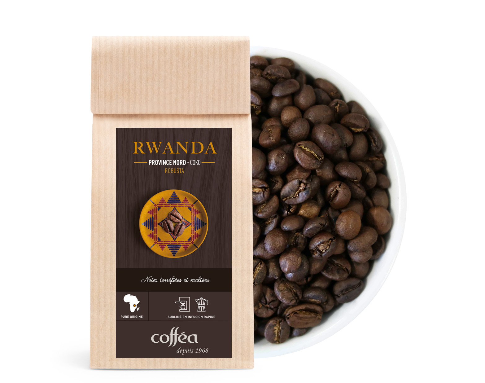 La zone est composée de plusieurs milliers de producteurs qui possèdent chacun une parcelle de terre. Avec ses lacs et ses montagnes, la province du Nord est idéale pour le développement d'excellents cafés. L'altitude est supérieure à 1600 mètres, ce qui est idéal pour l'épanouissement des caféiers. Le terroir appelé Coko possède un climat de savane, avec un hiver sec. Les précipitations y sont beaucoup plus importantes en été qu'en hiver. La température moyenne annuelle est de 21,3°C et les précipitations sont de 828 ml. Certaines forêts ont été conservées et de nombreuses randonnées sont proposées près du volcan Visoke, d'où il est possible de voir des Gorilles ! En effet, depuis 10 ans la population des gorilles a progressé au Rwanda. Le Robusta Coko procure à sa première dégustation une expérience unique