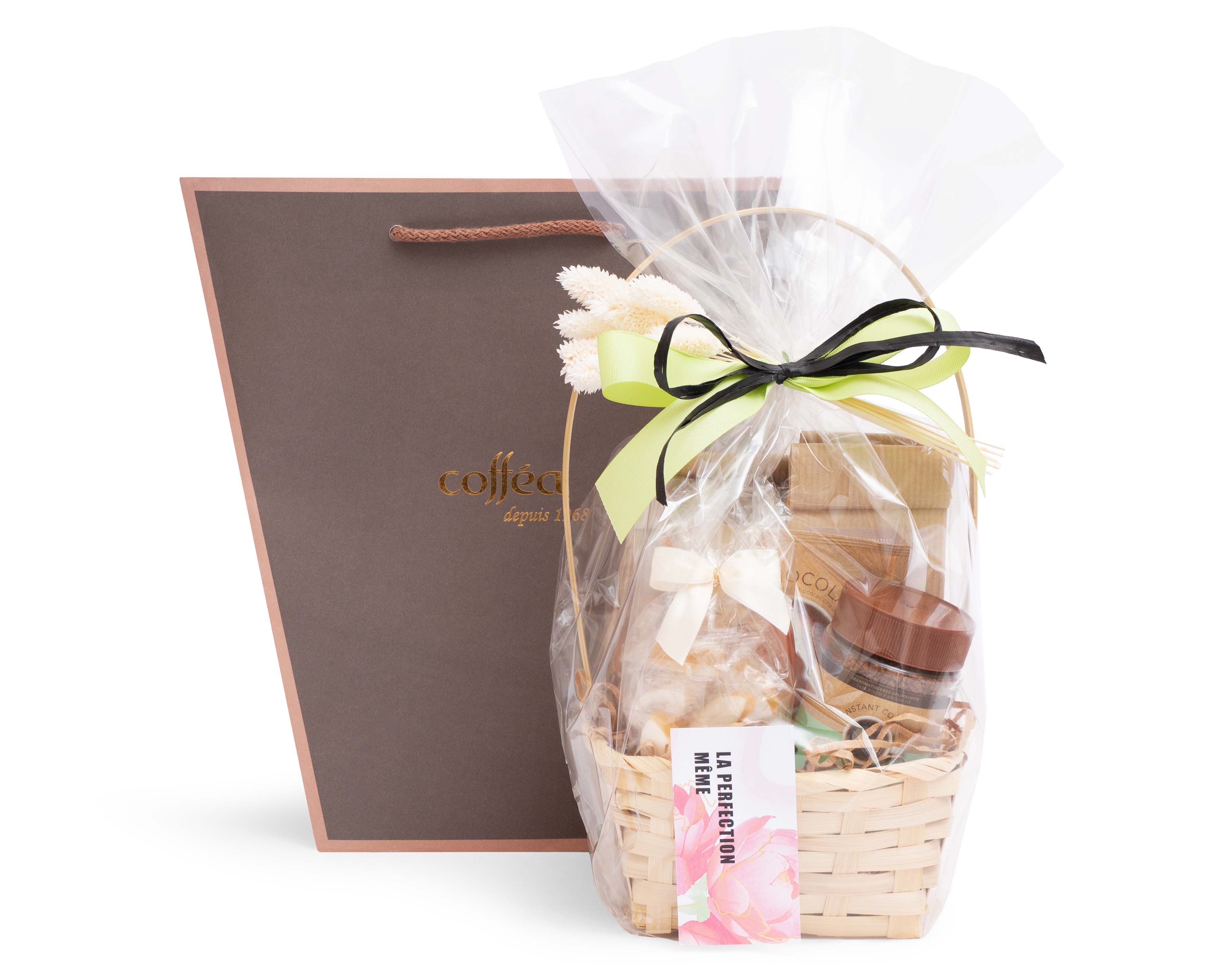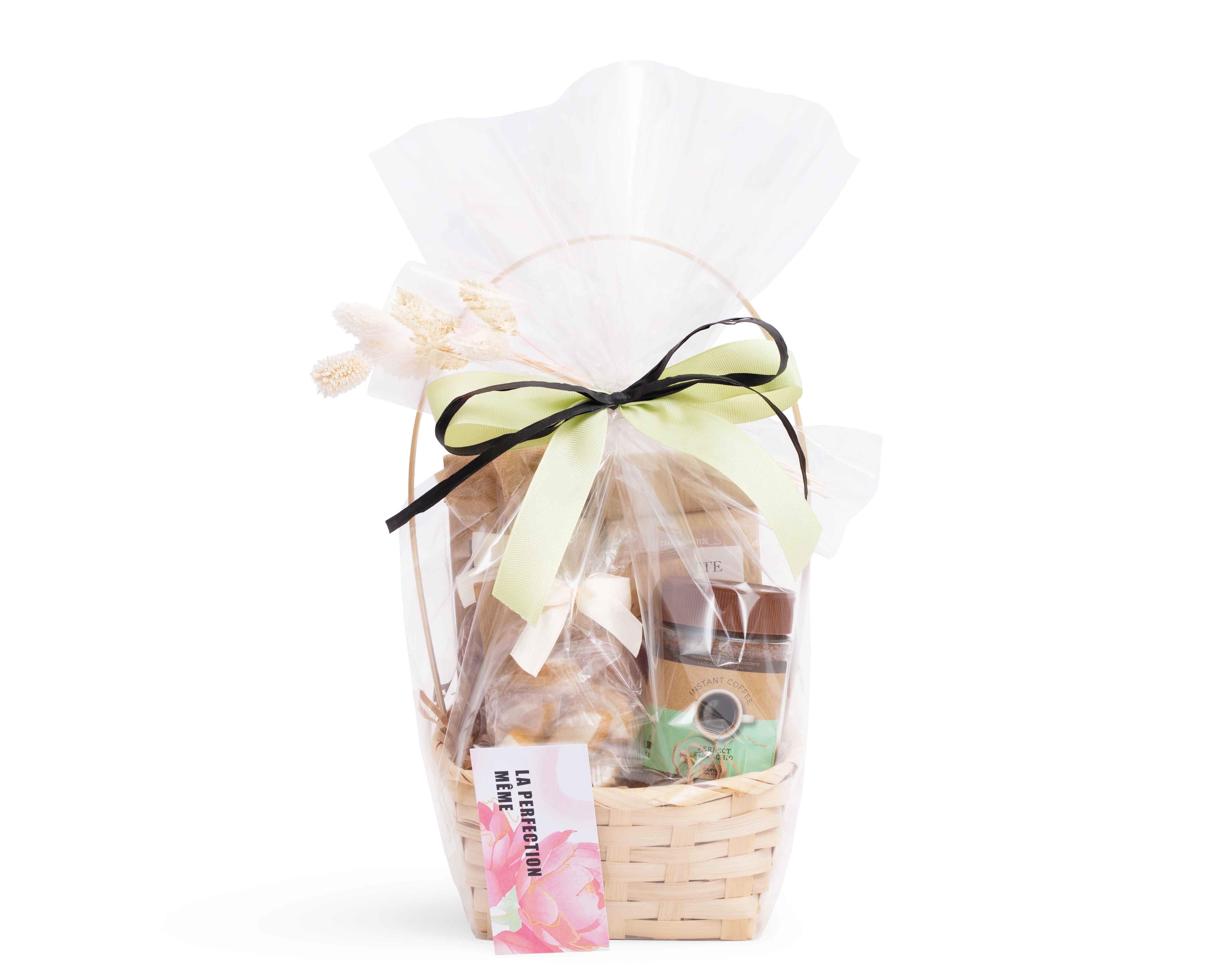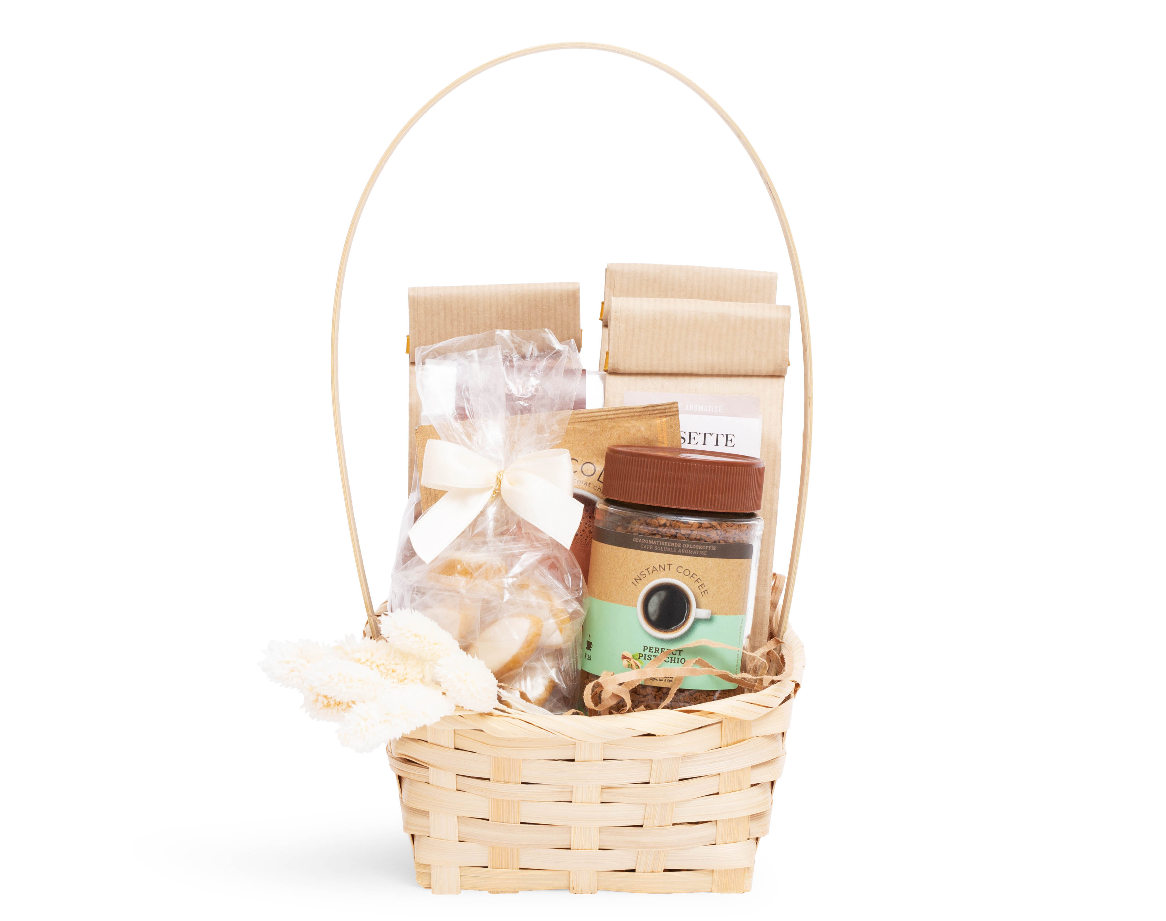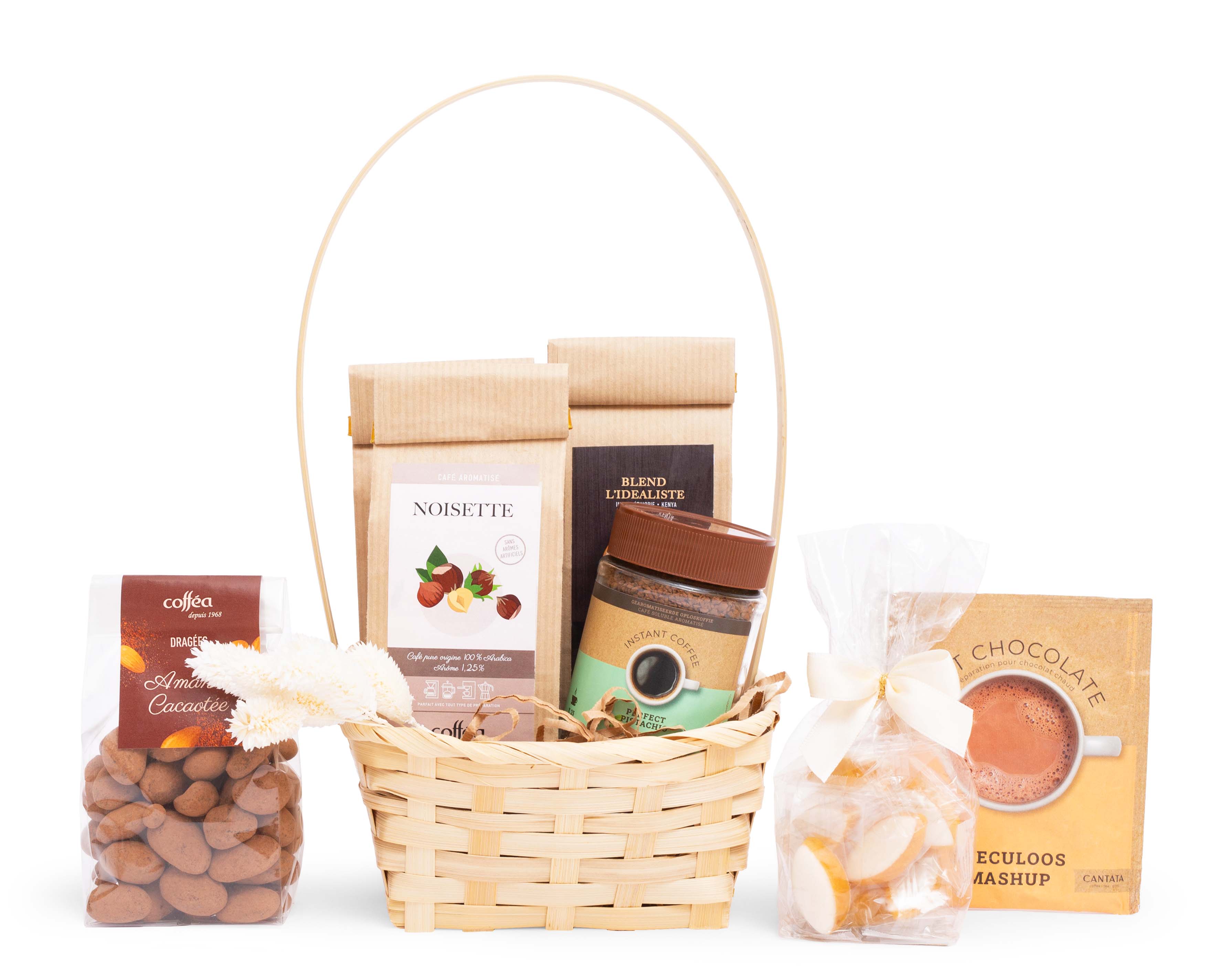 La cantate du café est une mélodie qui donne de l'inspiration. Avec ce panier, l'inspiration est assurée : à l'intérieur se trouvent quatre variétés de café et un chocolat chaud accompagnés de douceurs gourmandes. Avec une superbe finition et un contenu riche, ce cadeau est idéal pour ce printemps.