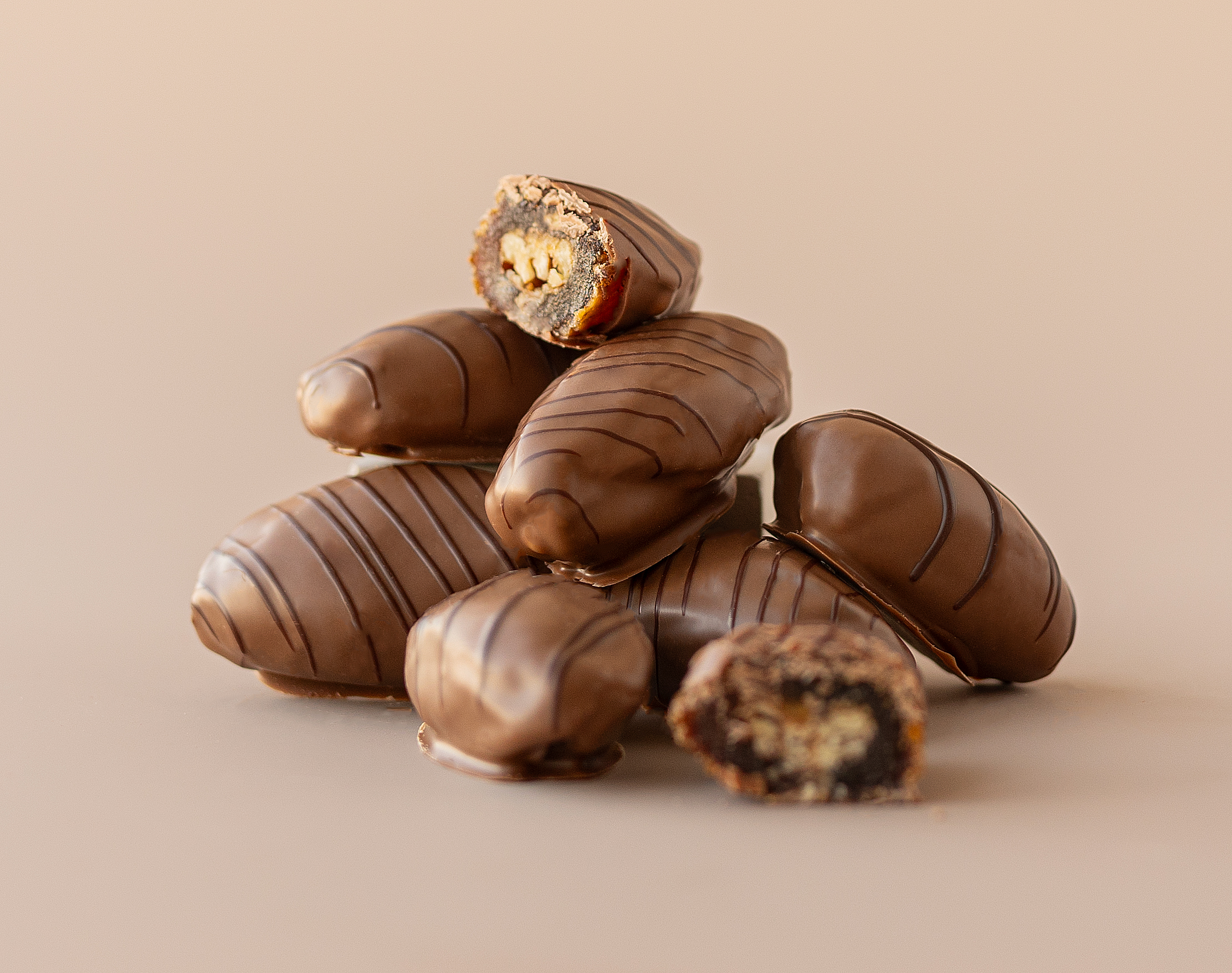 Nos dattes chocolat au lait noix de pécan réunissent toute la douceur de la datte séchée et le fondant du chocolat au lait. Chaque datte est garnie d’une noix de pécan entière, offrant un croquant délicat et des notes chaleureuses subtilement caramélisées. L’enrobage de chocolat au lait, doux, crémeux et vanillé, vient envelopper l’ensemble d’une texture onctueuse et réconfortante.