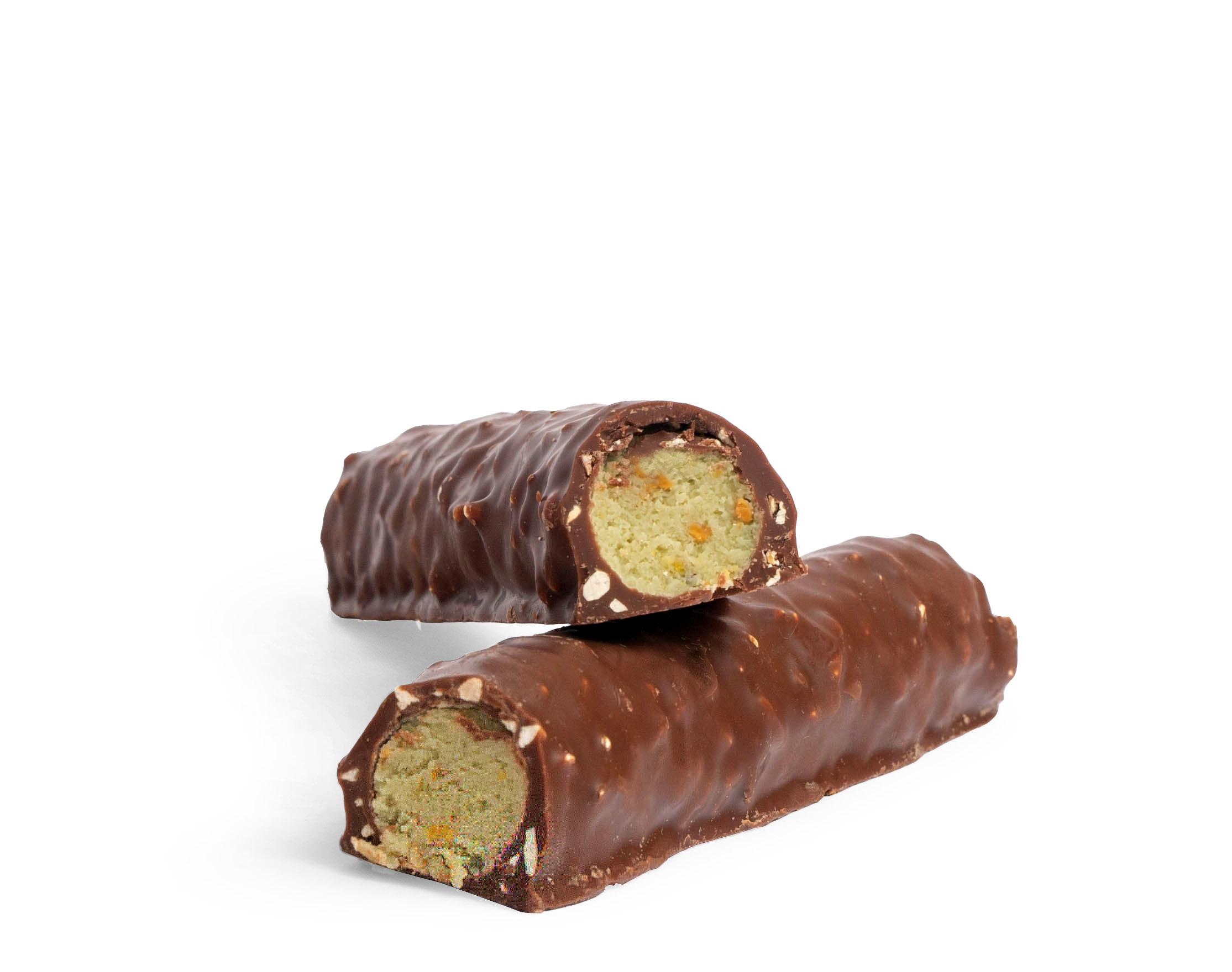 Pour les amoureux de la pâte d’amande, délice généreusement fourré en pâte d’amande est pistache, enrobé de chocolat au lait.