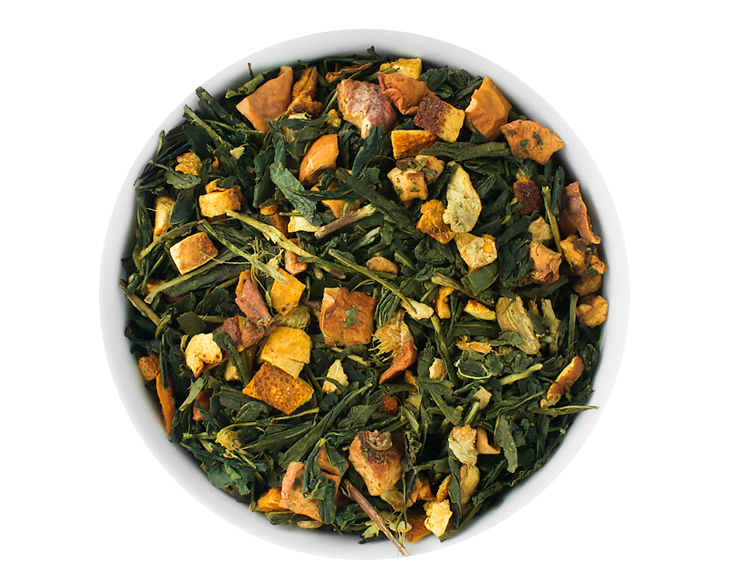 Ingrédients : Thé vert Sencha, thé vert brouillard de Chine, thé blanc Pai Mu Tan, écorces d’orange (6%), arôme naturel, fleurs d’oranger (3%).