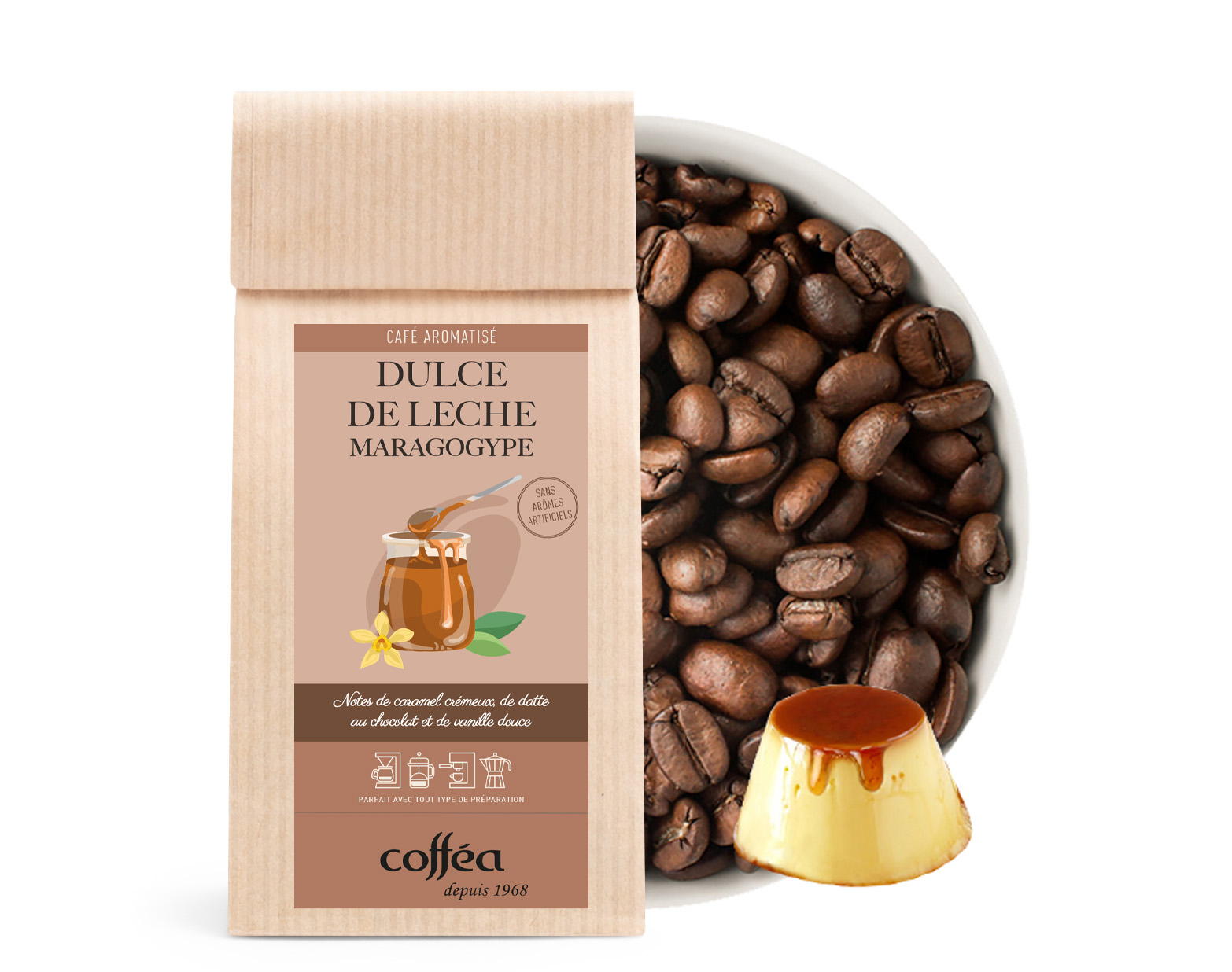 Le Café Grains Aromatisé Dulce de Leche Maragogype est une véritable gourmandise en tasse, idéal pour les amateurs de cafés doux et crémeux. Issu de la variété Maragogype, connue pour ses gros grains et sa faible teneur en caféine, ce café offre une expérience aromatique unique, subtilement équilibrée.