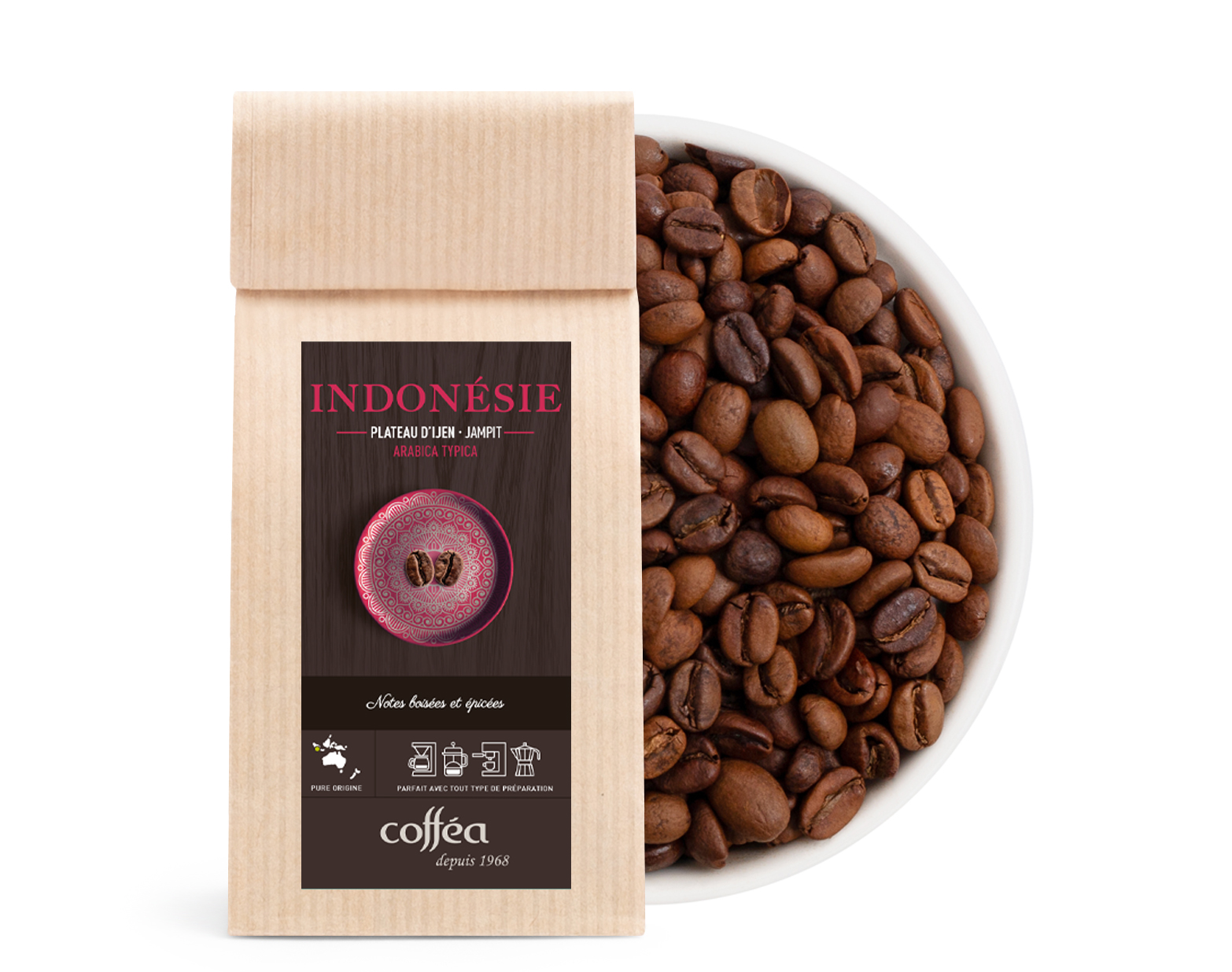 Ce café, lavé et séché au soleil, puise sa richesse dans les sols volcaniques et le climat tropical de Java, où 3 000 hectares sont dédiés à sa culture.
