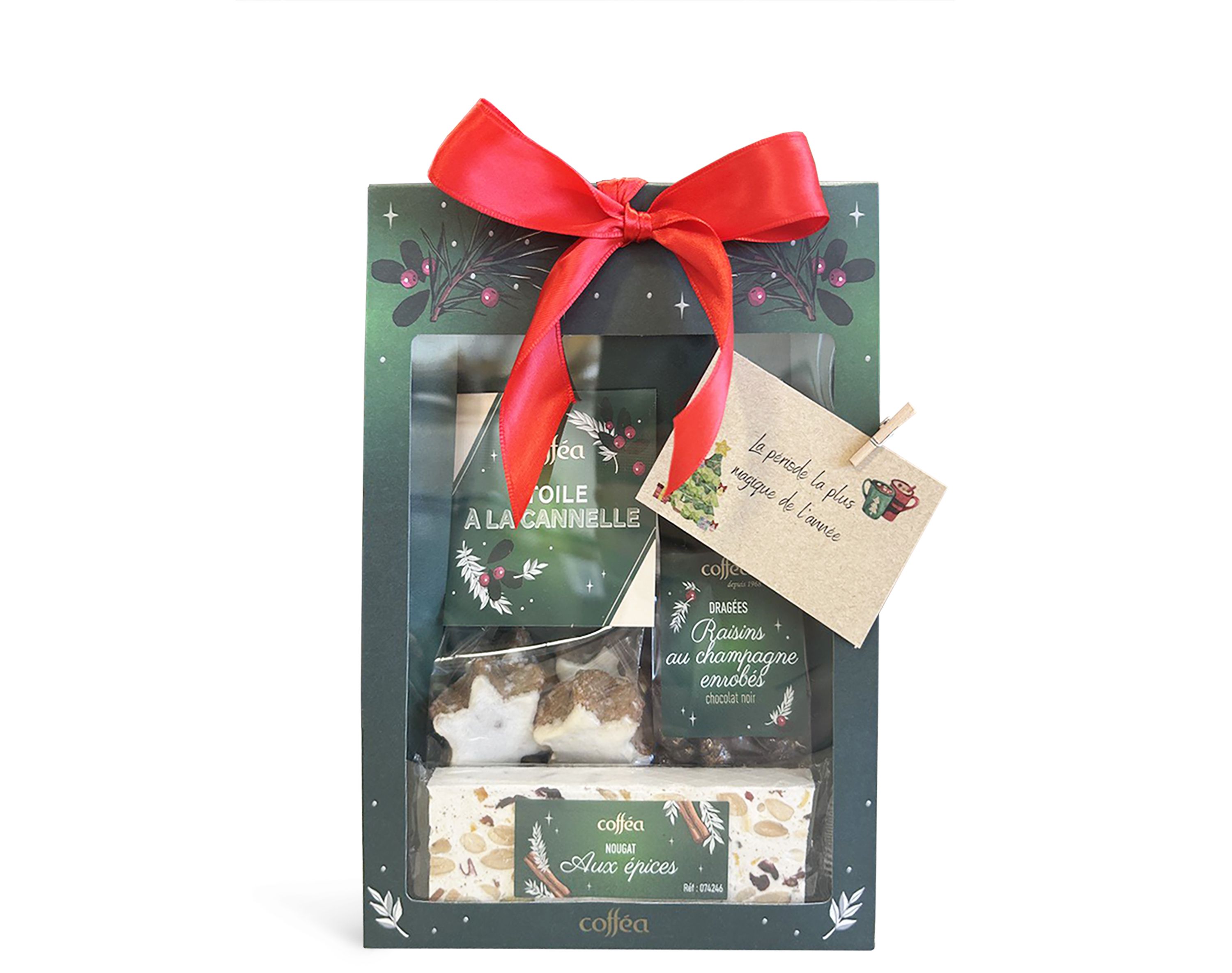 Offrez une touche de magie gourmande avec cette pochette cadeau festive ! Elle contient du nougat délicatement parfumé aux épices de Noël, des biscuits étoilés à la cannelle, croquants et parfumés, et des raisins au champagne enrobés de chocolat noir pour une expérience raffinée et pétillante. Un assortiment de douceurs parfait pour enchanter les papilles et célébrer la saison des fêtes.