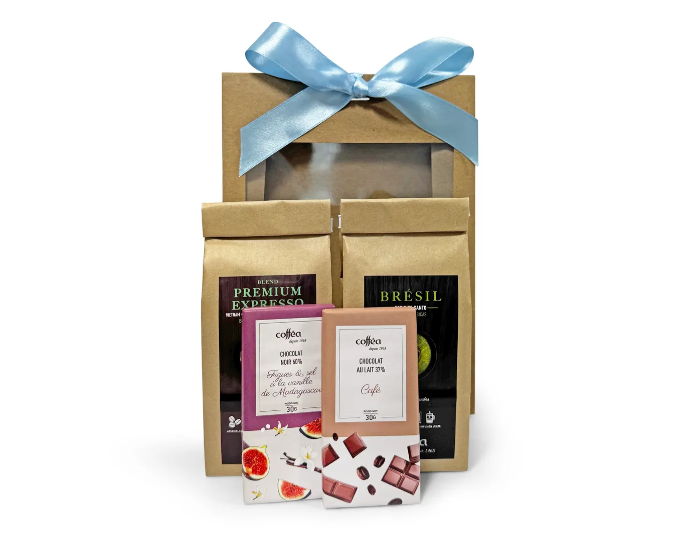 Le blend Premium Expresso offre sa puissance équilibrée, tandis que le Brésil Espirito Santo dévoile ses notes douces et généreuses. Pour sublimer l'instant, deux mini tablettes de chocolat, café au lait onctueux et figue-sel à la vanille de Madagascar, créent des accords parfaits avec chaque tasse.