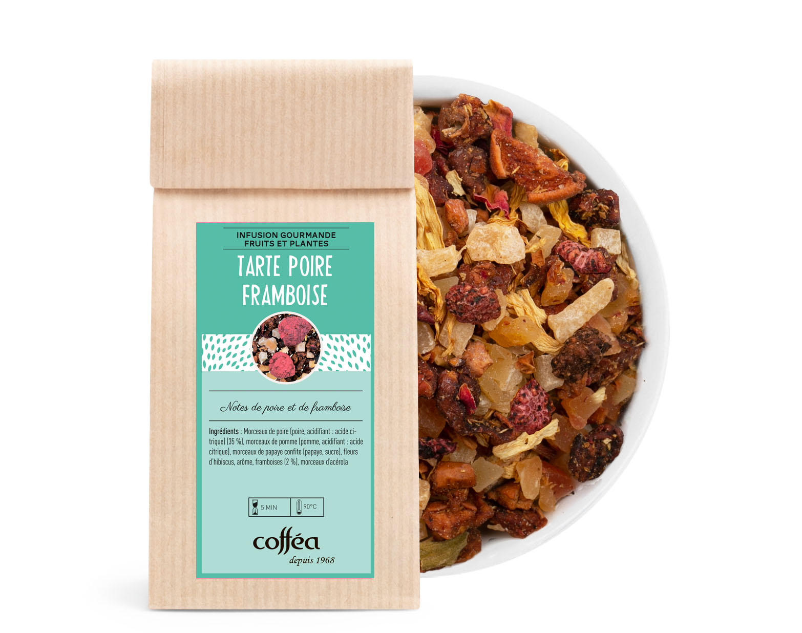 Ingrédients : Morceaux de poire, fleurs d'hibiscus, écorces de cynorrhodon, arômes naturels, framboises.