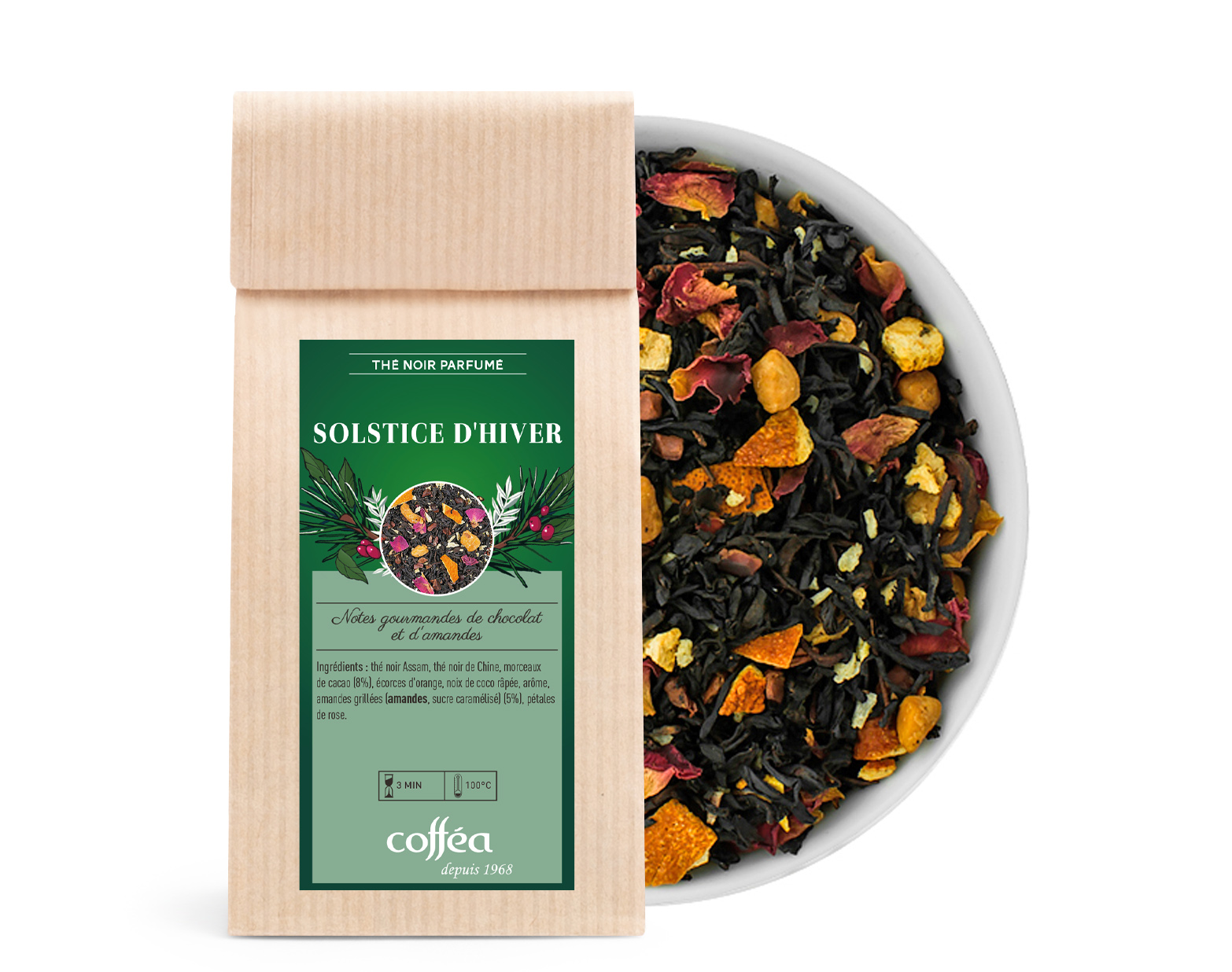 Ingrédients : thé noir Assam, thé noir de Chine, morceaux de cacao (8%), écorces d’orange, noix de coco râpée, arôme, amandes grillées (amandes, sucre caramélisé) (5%), pétales de rose.