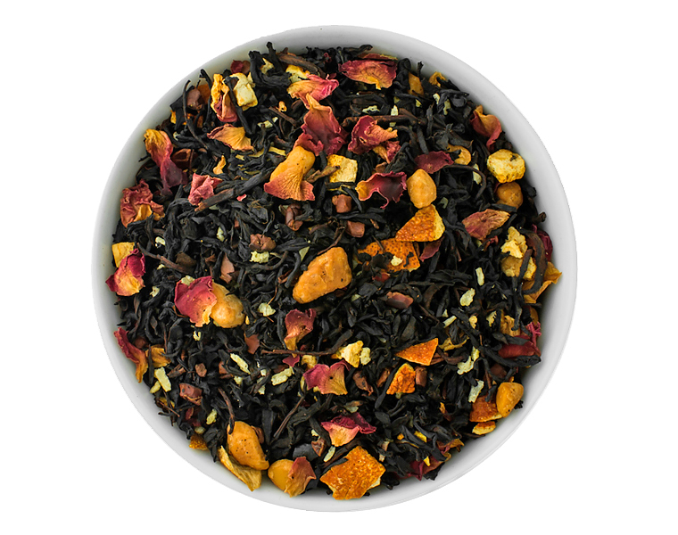 Thé noir Assam, thé noir de Chine, morceaux de cacao, écorces d'orange, noix de coco râpée, arôme, amandes grillées (amandes, sucre caramélisé), pétales de rose.