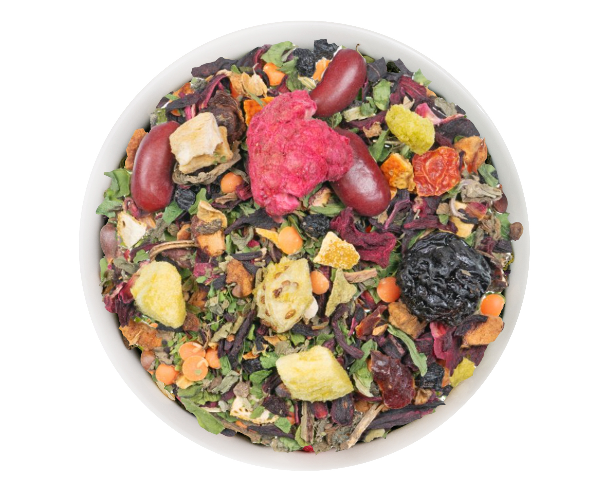 Ingrédients: fleurs d'hibiscus, morceaux de pomme, morceaux de betterave rouge, pissenlit, écorces d'orange, haricots rouges, lentilles rouges, écorces de cynorrhodon, arôme, flocons d'épinard, morceaux de banane, baies de sureau, morceaux de kiwi (2%), cerises (1,5%), framboises, fer (0,7%).