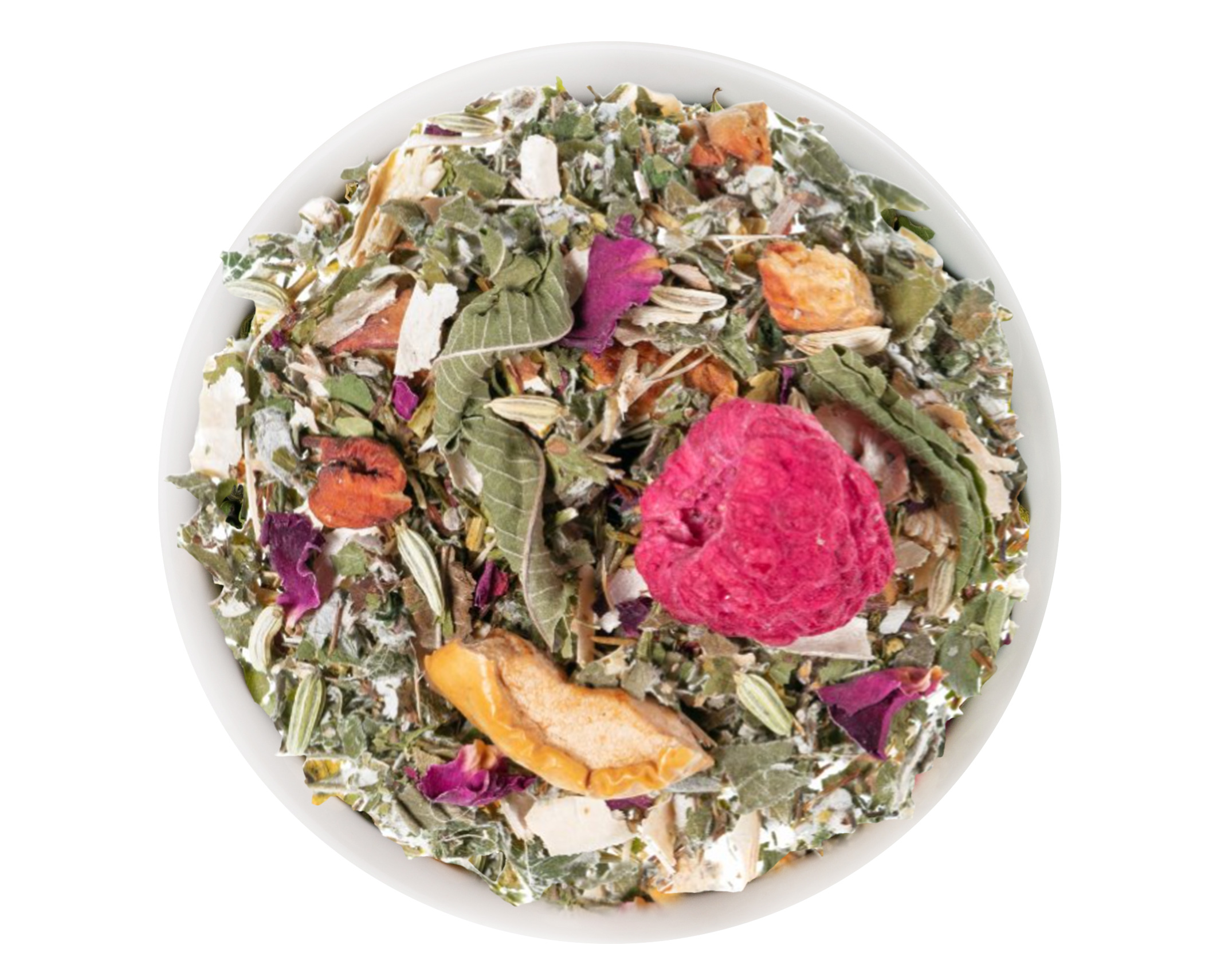 Ingrédients: rooibos vert, morceaux de pomme, cosses de haricot, verveine citronnelle, feuilles de framboisier, fenouil, arôme naturel, thym (2 %), pétales de rose, fleurs d’hibiscus blanches, framboises (1 %).