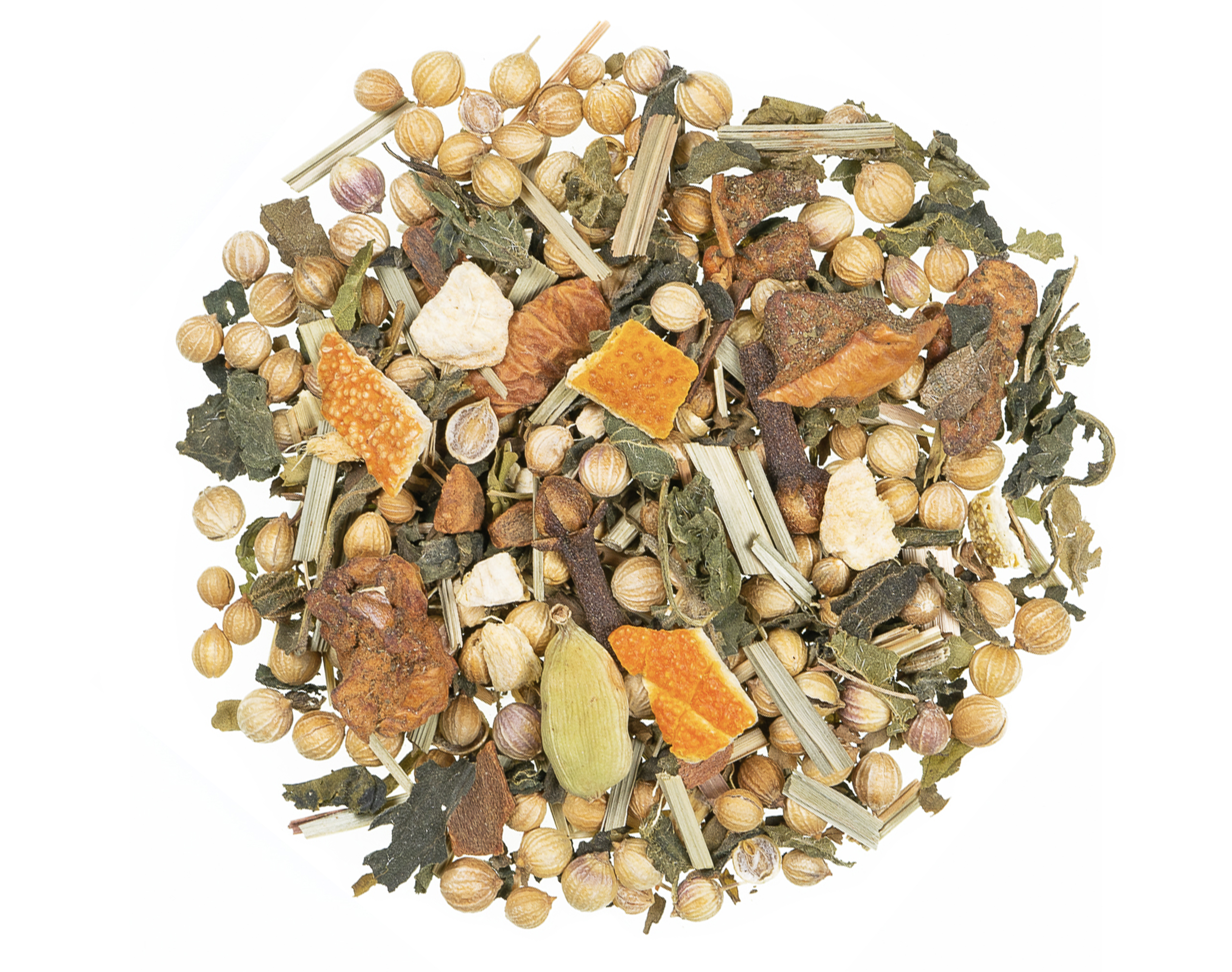 Ingrédients : Coriandre*, menthe nanah* (15 %), feuilles d’ortie*, écorces d’orange*, citronnelle* (7 %), morceaux de pomme (pomme*, acidifiant : acide citrique), écorce de cannelle*, morceaux de gingembre*, arômes naturels, clous de girofle*, cardamome*. (*Ingrédients issus de l’Agriculture Biologique.)