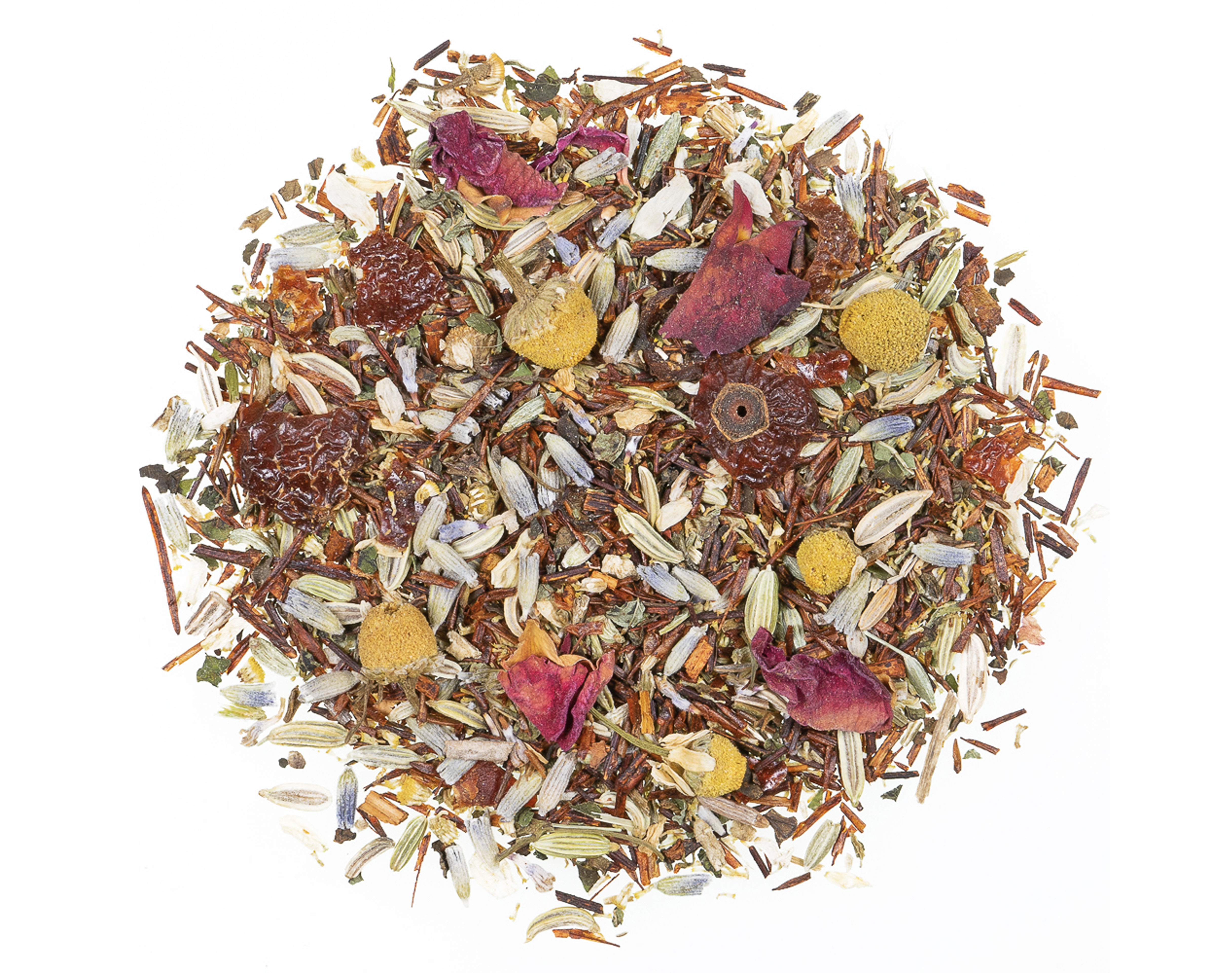 Ingrédients : Rooibos*, fenouil*, écorces de cynorrhodon*, fleurs de camomille* (15%), feuilles de mélisse*, fleurs de lavande* (4%), feuilles de fleur de rose. *Ingrédients issus de l'Agriculture Biologique